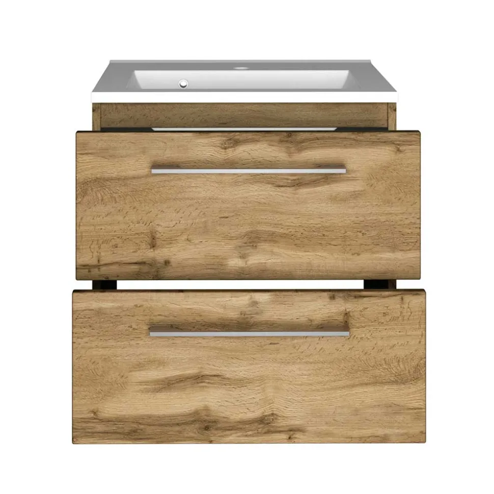 Die Front des Waschtischs besteht aus langlebigem MDF und ist foliert – diese Beschichtung verleiht dem Möbelstück nicht nur eine besonders schöne Oberfläche in Wildeichefarben, sondern schützt es auch zuverlässig vor Feuchtigkeit. Der Korpus wird aus robuster Spanplatte gefertigt und ist melaminbeschichtet. Eine Melaminbeschichtung zeichnet sich durch ihre hohe Widerstandsfähigkeit aus: Sie ist abriebfest, pflegeleicht und bietet eine edle Holzoptik, die in jedem Bad eine warme, natürliche Atmosphäre schafft. In Kombination mit dem Innendekor in Weiß und den edlen Bügelgriffen aus Metall entsteht ein stimmiges Gesamtbild, das zeitlos und elegant wirkt.