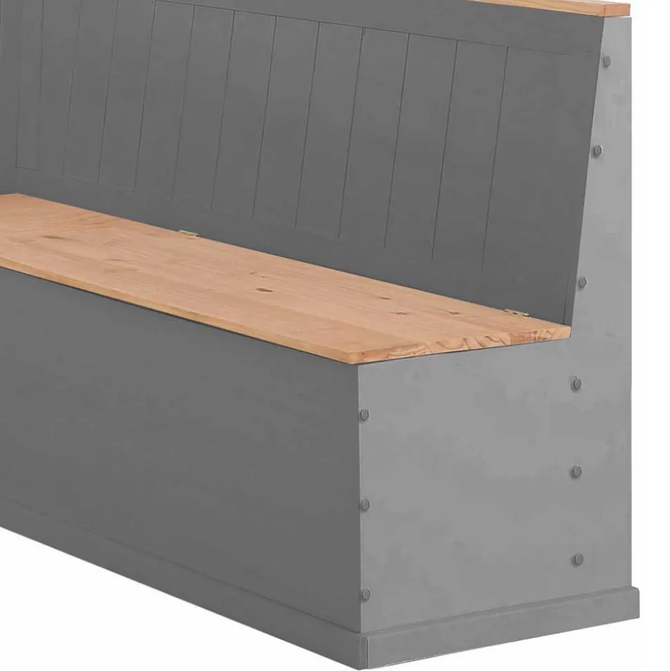 Die Truhen-Eckbank „Bernau“ vereint rustikale Eleganz mit durchdachtem Stauraum und wird zum perfekten Mittelpunkt Ihres Essbereichs. Die zweifarbige Gestaltung in Grau und Kieferfarben unterstreicht den gemütlichen Landhausstil, während die massive Kiefernholz-Konstruktion für langlebige Stabilität sorgt. Mit ihren großzügigen Sitzflächen bietet sie Platz für vier Personen und lädt zu geselligen Runden ein.