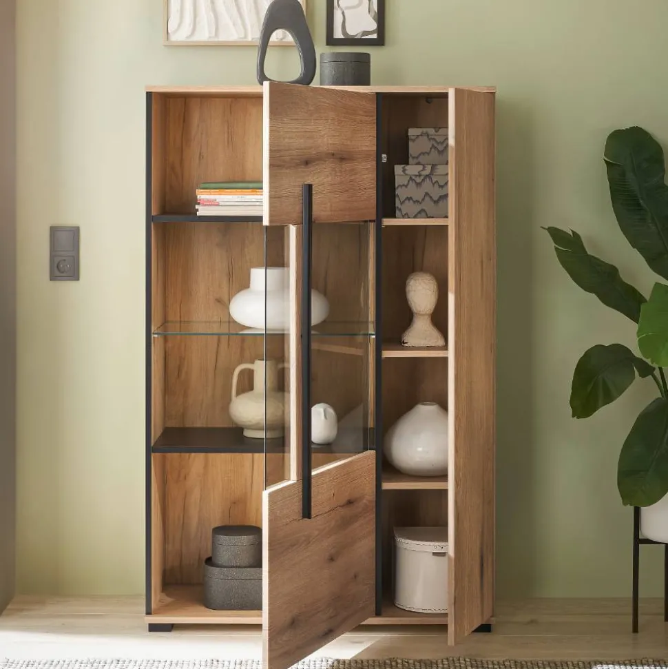 Das Set besteht aus einem stilvollen TV-Lowboard, einem imposanten Highboard, einer edlen Standvitrine und einem formvollendeten Wandboard. Zusammen erschaffen sie ein durchdachtes Gesamtkonzept, das Wohnästhetik neu definiert. Hier trifft klare Linienführung auf natürliche Holzoptik – ein Zusammenspiel, das Wärme ausstrahlt und gleichzeitig modern wirkt. Jeder Raum profitiert von der stimmigen Präsenz dieser Möbel.