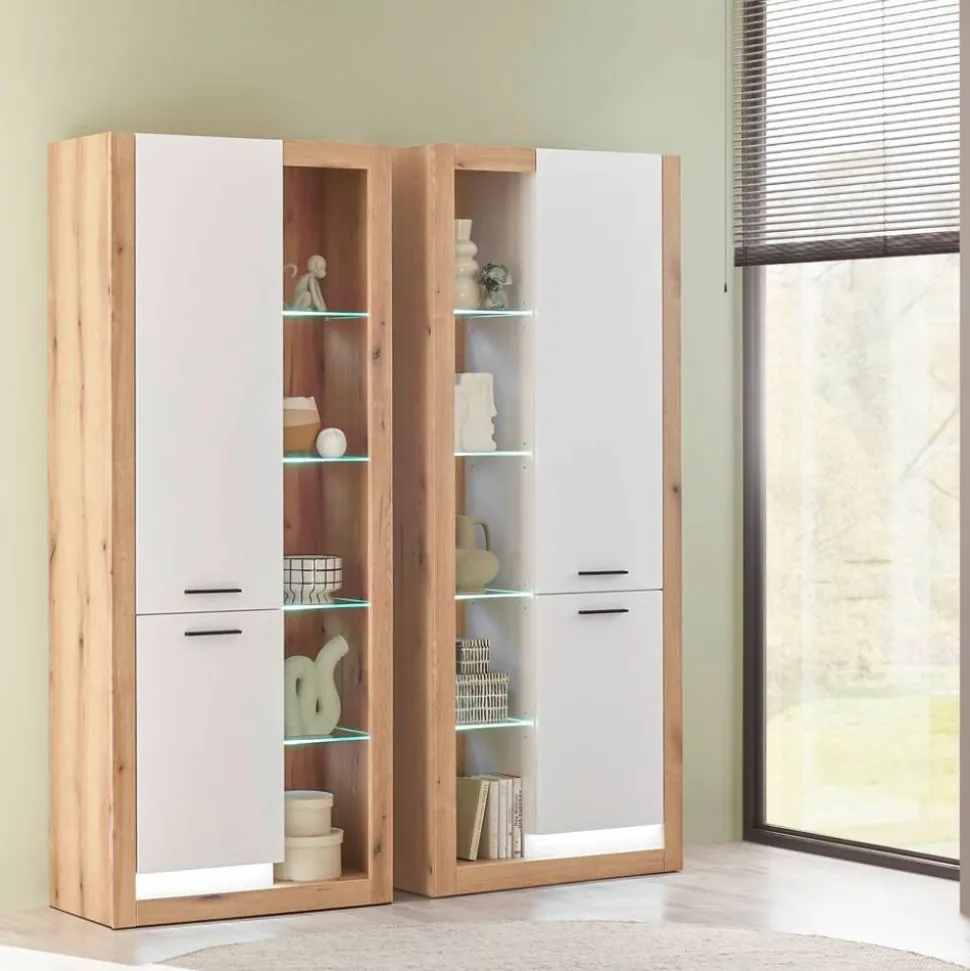 Die Fronten bestehen aus robustem MDF, der Korpus aus stabiler Spanplatte. Die Oberflächen sind in Holzoptik Eiche Natur foliert und in Mattweiß tiefgezogen foliert, wodurch eine harmonische Verbindung von Natürlichkeit und modernem Design entsteht. Schwarze Metall-Griffleisten unterstreichen den zeitgemäßen Look und ermöglichen ein komfortables Öffnen der Türen. Optional kann das Set mit LED-Beleuchtung bestellt werden, die Ihre Lieblingsobjekte gekonnt in Szene setzt.