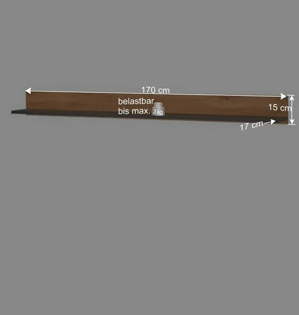 Hängeboards Zum Set gehören zwei identische Hängeboards mit den Maßen 170x15x17 cm (BxHxT). Die Rückwand ist in Wildeiche Holzdekor gehalten, die Ablagefläche farblich in Anthrazit abgesetzt und 15 cm tief. Jedes Board ist bis zu 3 kg belastbar – ideal für leichte Dekoration oder Bilderrahmen.