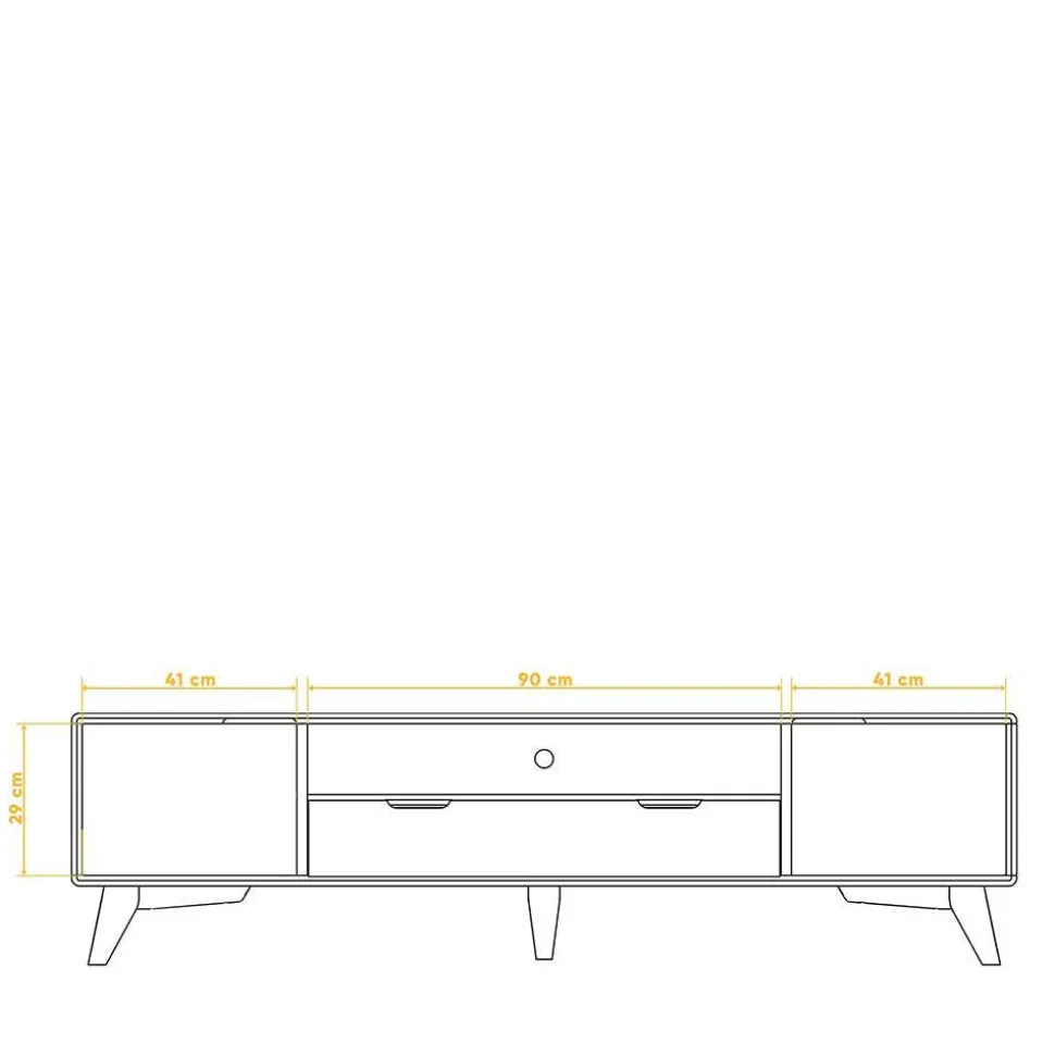 Ein weiteres Highlight des „Junola I“ TV-Lowboards ist das dekorativ abgeschrägte Vierfußgestell, das von einem zusätzlichen Stützfuß ergänzt wird. Dieses Detail verleiht dem Möbelstück eine leichte, schwebende Optik, ohne dabei auf Stabilität zu verzichten.