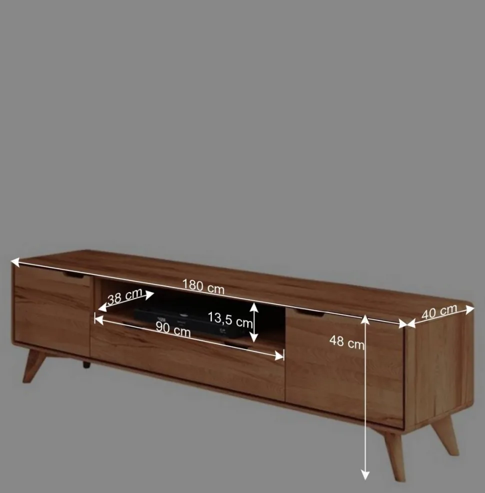 Mit seinen 180 cm Breite, 48 cm Höhe und 40 cm Tiefe ist „Junola I“ perfekt geeignet für Fernseher mit einer Größe von bis zu 75 Zoll. Hinter den beiden Türen verbergen sich geräumige Fächer (BxHxT: je ca. 41x29x38 cm), die viel Platz für Ihr TV-Zubehör bieten. Das offene Gerätefach (Maße: ca. 90×13,5×38 cm) ist ideal für Receiver, DVD-Player oder Spielekonsolen. Eine Aussparung in der Rückwand sorgt für eine ordentliche Kabelführung.