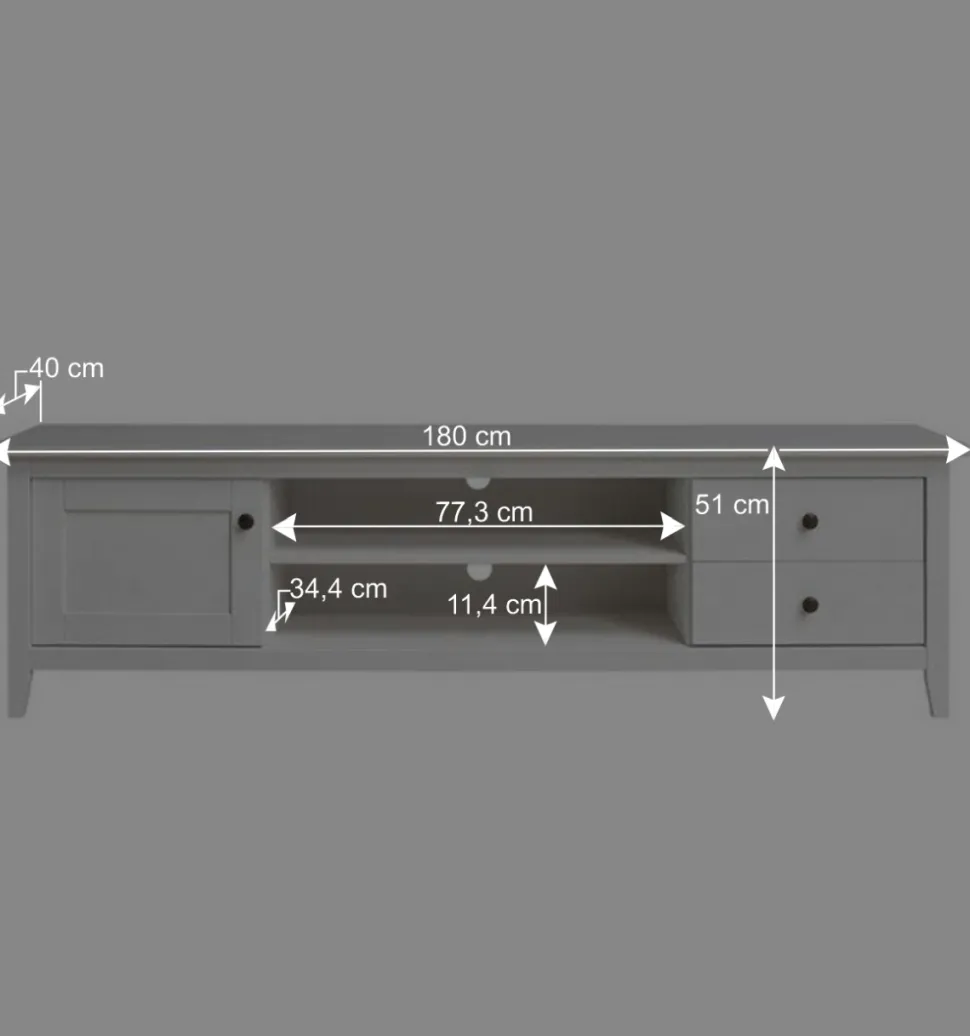 Mit seinen Abmessungen von 180 cm Breite, 51 cm Höhe und 40 cm Tiefe bietet das Lowboard ausreichend Platz für Fernseher verschiedenster Größen.
