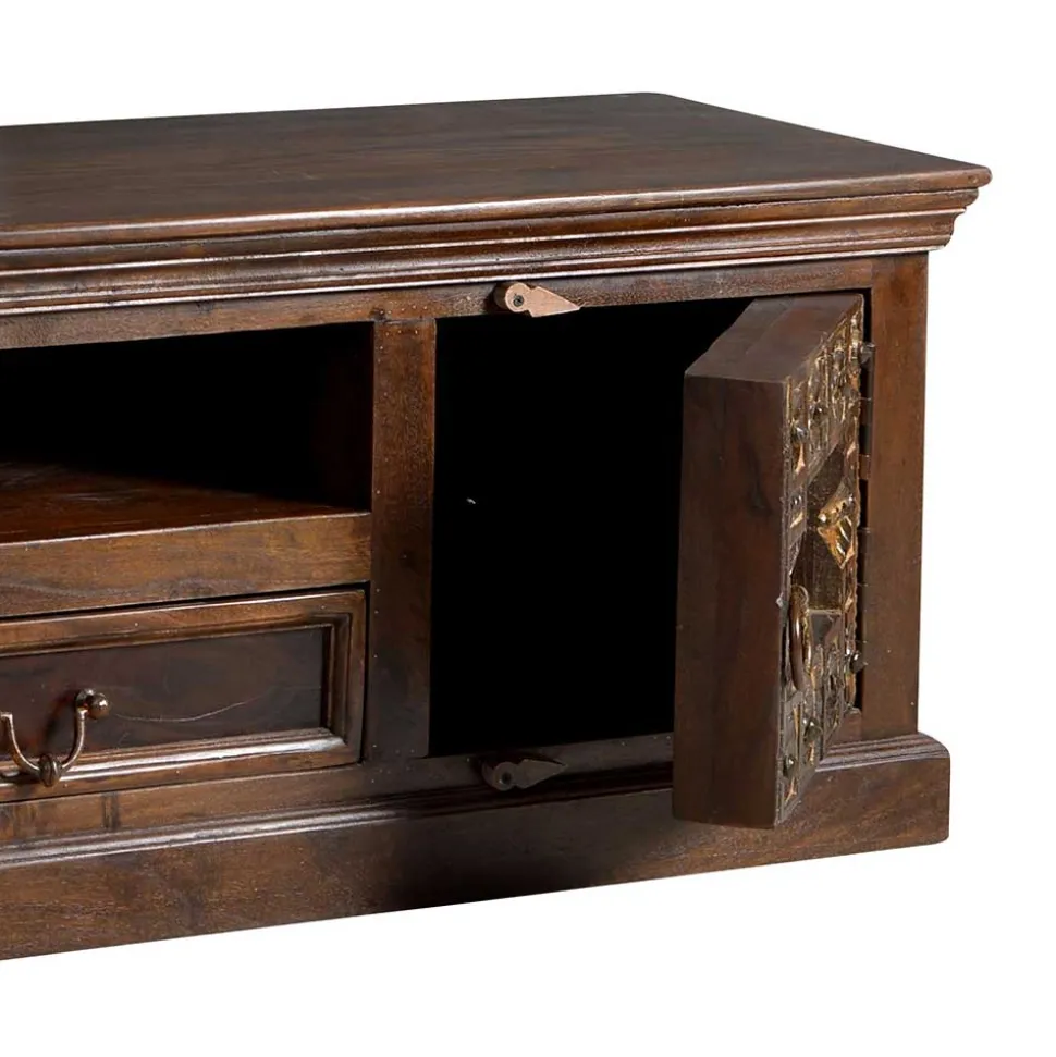 Aufwendige Schnitzereien und Metallapplikationen zieren die Türfronten und machen sie zu echten Hinguckern. Dazu gesellen sich nostalgische Metallringe als Griffe und kleine Holzriegel, mit denen die Türen verschlossen werden können. Eine stabile Schublade auf robusten Holzauszügen bietet zusätzlichen Stauraum, während ein offenes Fach weitere Ablagemöglichkeiten bietet.