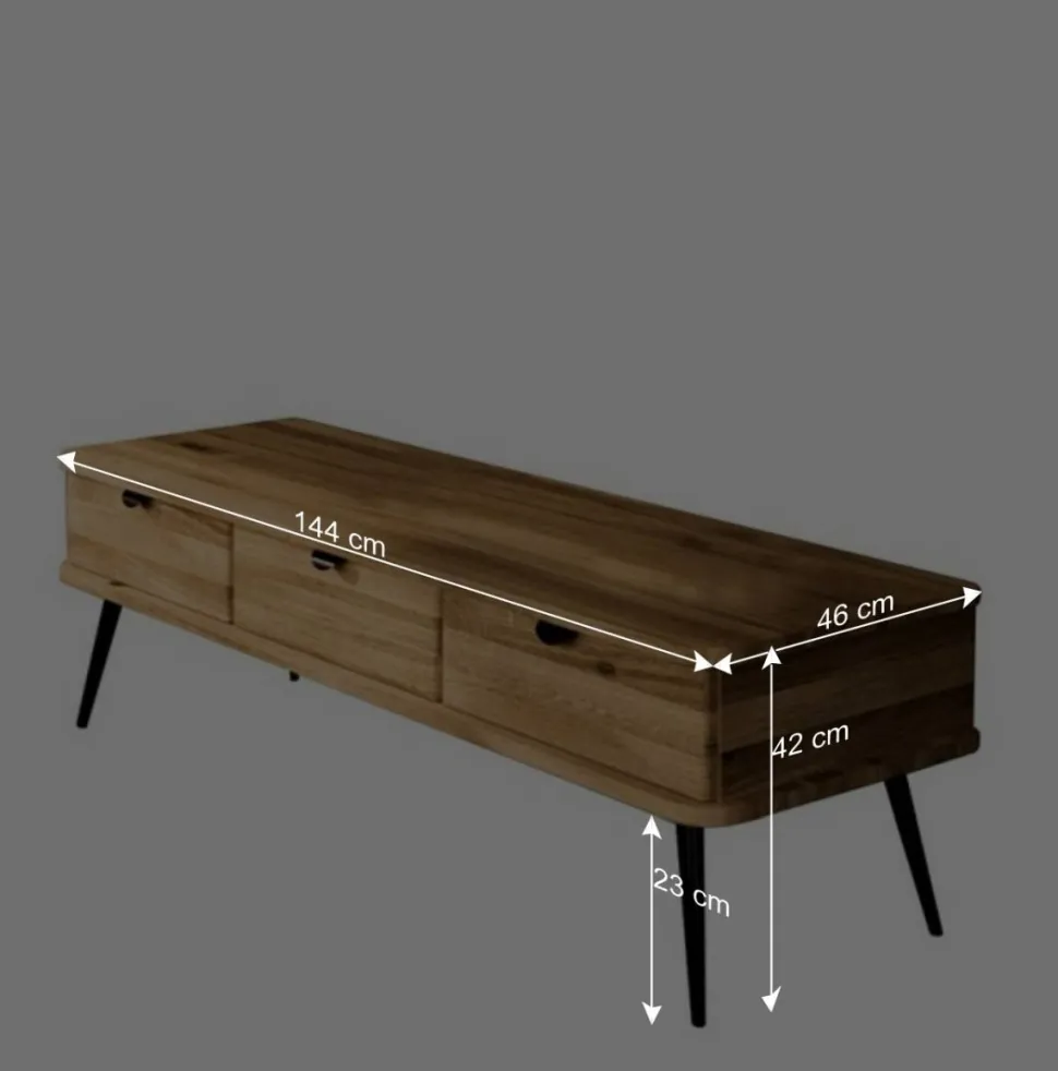 Mit seinen Maßen von 144 cm Breite, 42 cm Höhe und 46 cm Tiefe bietet das TV-Lowboard übersichtlichen Stauraum für Mediengeräte und Zubehör. Drei Schubladen mit Metall-Kugelauszug und Soft Close Funktion, die jeweils eine Innenhöhe von ca. 10 cm haben, bieten optimalen Stauraum. Dezente Metall-Kantengriffe in Schwarz an den Schubladen sorgen für ein harmonisches Gesamtbild.