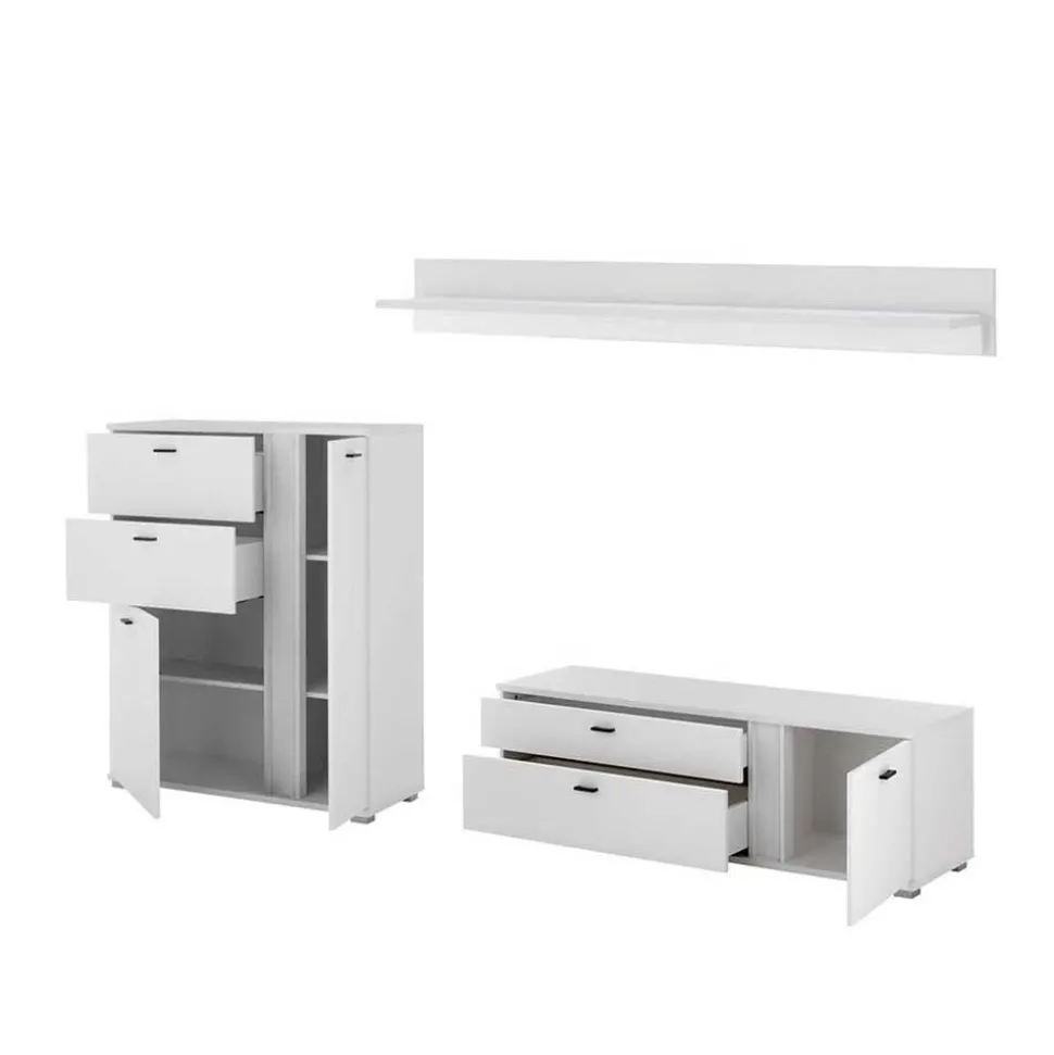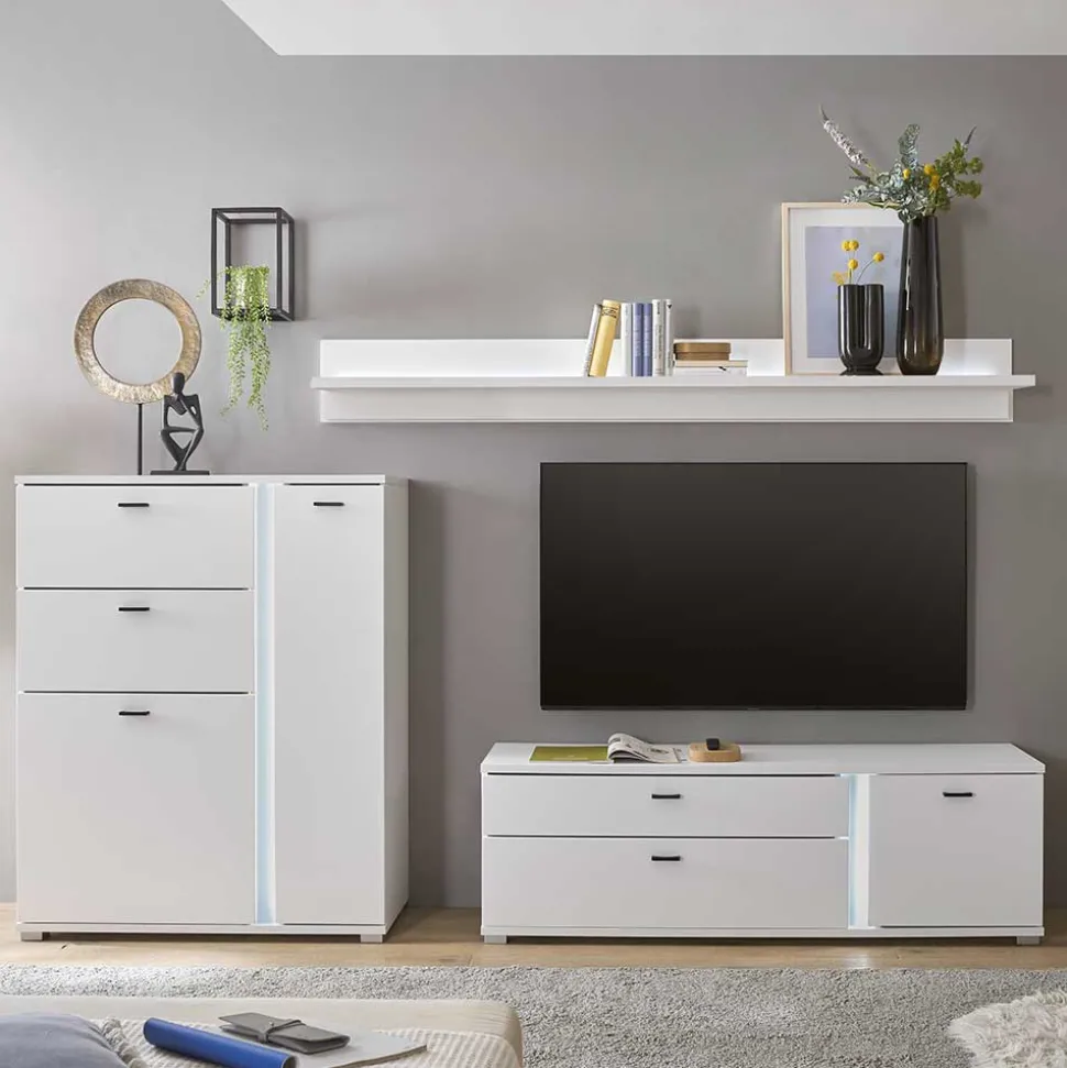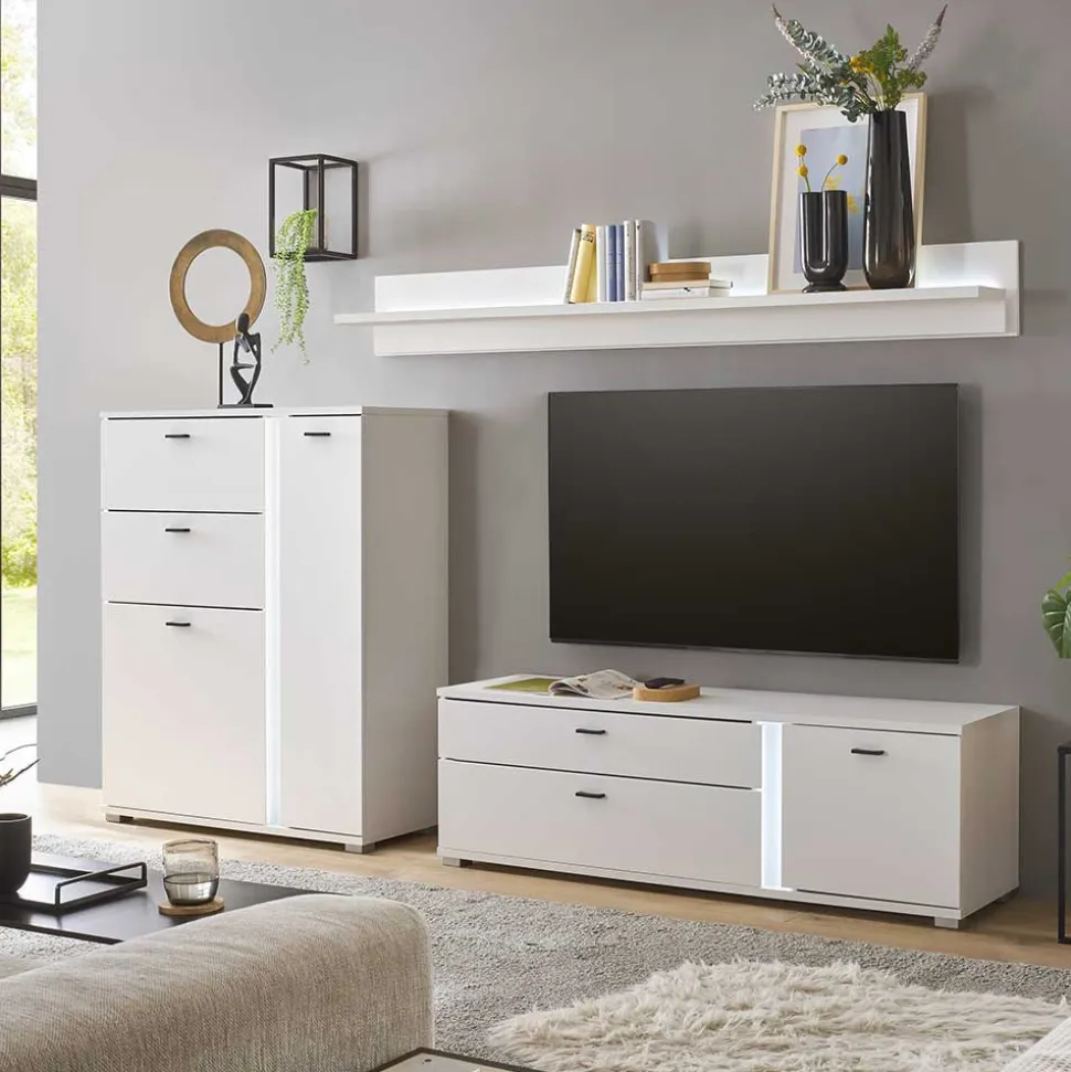 Eine harmonische Kombination aus Weiß und schwarzen Akzenten macht die TV Wohnwand Tirol zu einem echten Blickfang in jedem Wohnraum. Das edle Weiß bringt eine zeitlose Eleganz in Ihr Zuhause und lässt den Raum heller und freundlicher wirken. Die schwarzen Griffleisten aus Metall setzen moderne Akzente und verleihen der Wohnwand eine besondere Raffinesse. Hier trifft klassische Schlichtheit auf moderne Stilsicherheit – eine Kombination, die Sie und Ihre Gäste begeistern wird.