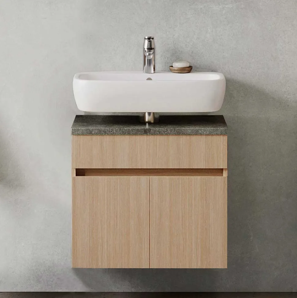 Bringen Sie mehr Struktur und Wärme in Ihr Badezimmer mit dem Unterbeckenschrank „Leitha“. Die helle Eichenholz-Optik mit fühlbarer Struktur verleiht Ihrem Raum ein wohnliches Flair, während die dunkelgraue Deckplatte in markanter Steinoptik einen stilvollen Kontrast setzt. Dank seines funktionalen Designs ist dieser Schrank die perfekte Ergänzung für Ihr Waschbecken – ideal, um Reinigungsutensilien oder Pflegeprodukte ordentlich zu verstauen. Gefertigt in Deutschland, überzeugt er mit hoher Verarbeitungsqualität und langlebigen Materialien.