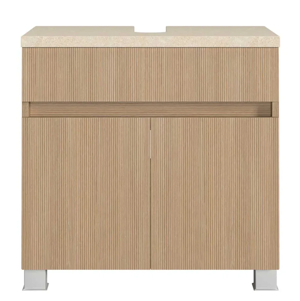 Schaffen Sie mehr Ordnung in Ihrem Badezimmer mit dem Unterbeckenschrank „Vibulam“. Die warme Eichenholz-Optik sorgt für ein natürliches Ambiente, während die Deckplatte in beiger Sandstein-Optik eine harmonische und stilvolle Ergänzung darstellt. Perfekt als Ergänzung für Ihr Waschbecken, bietet dieser Unterschrank genügend Platz für Pflegeprodukte, Putzutensilien und vieles mehr. Hergestellt in Deutschland, punktet „Vibulam“ mit hoher Qualität und durchdachtem Design.