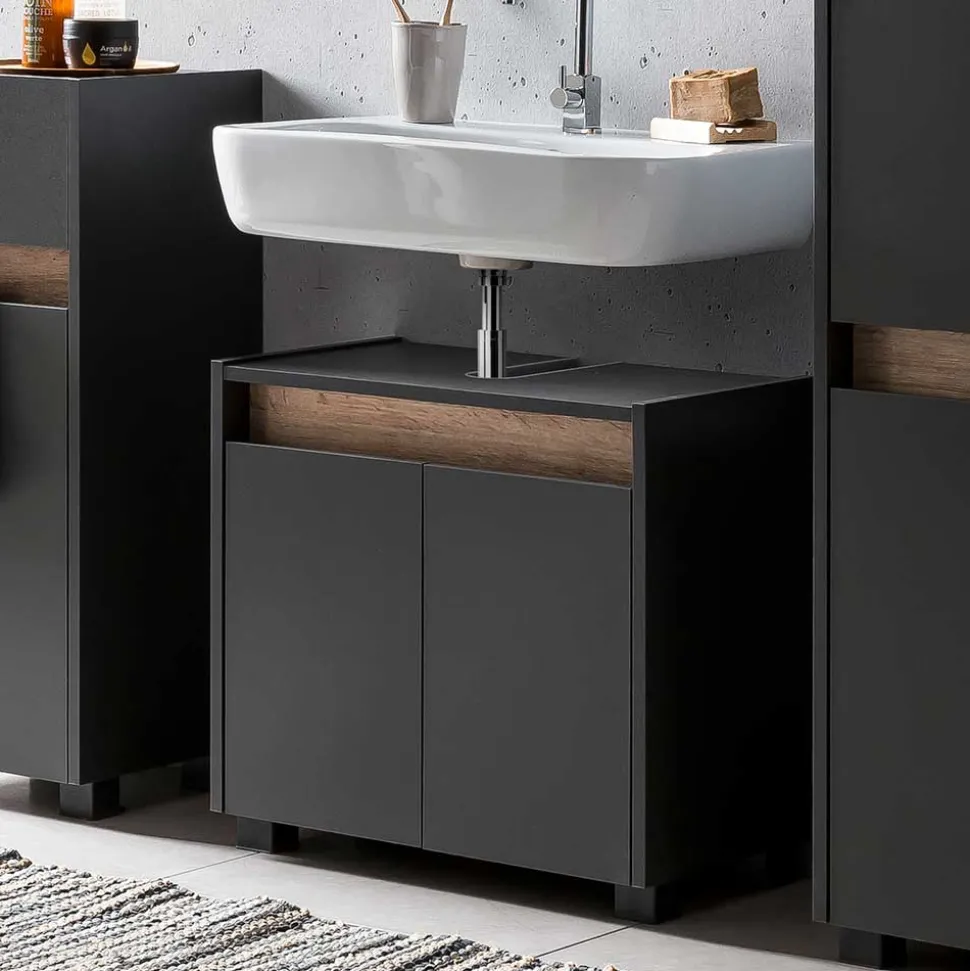 - Zeitgemäßer Unterbeckenschrank in Anthrazit und Wildeichefarben