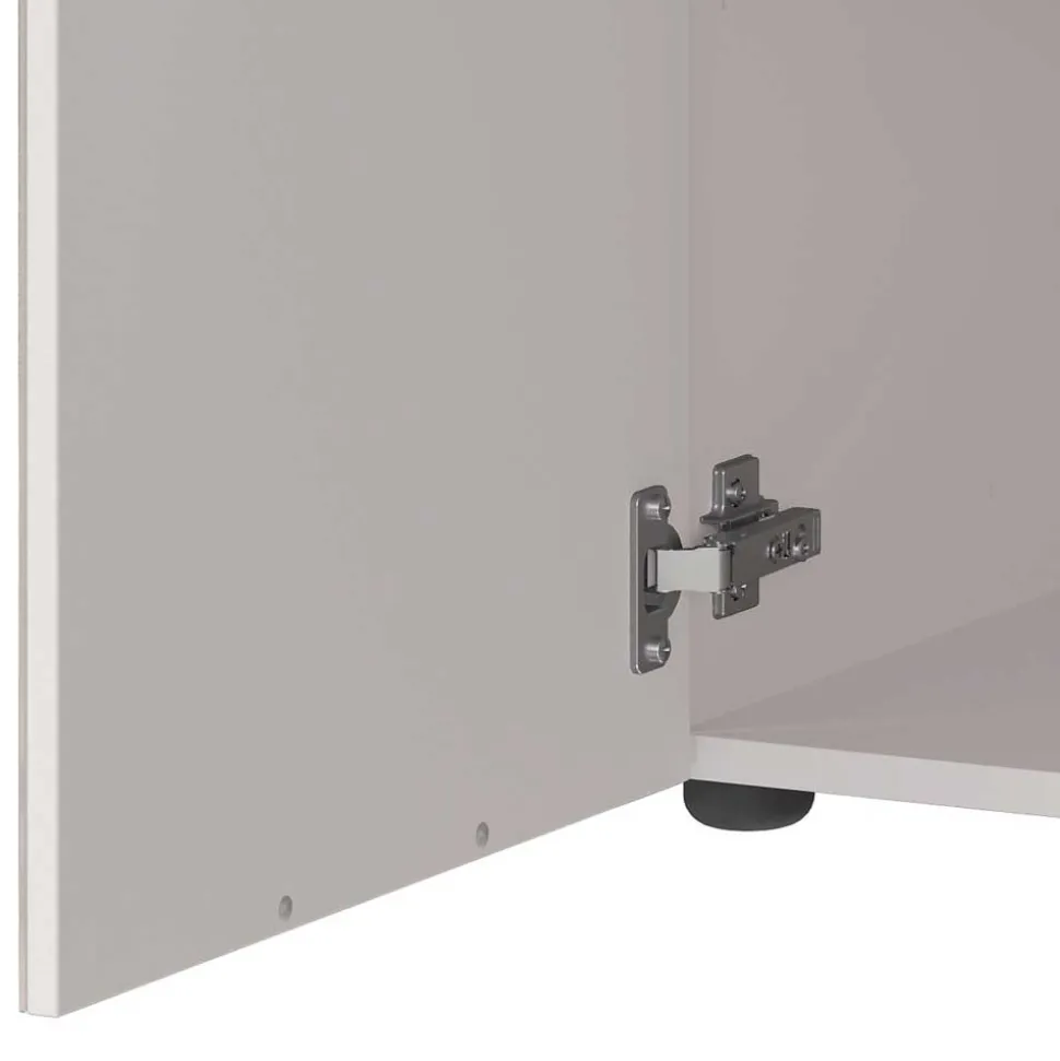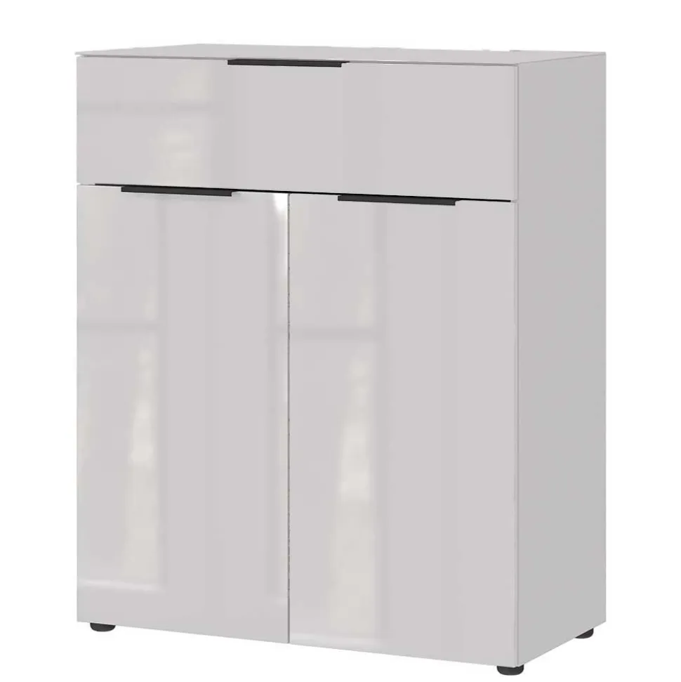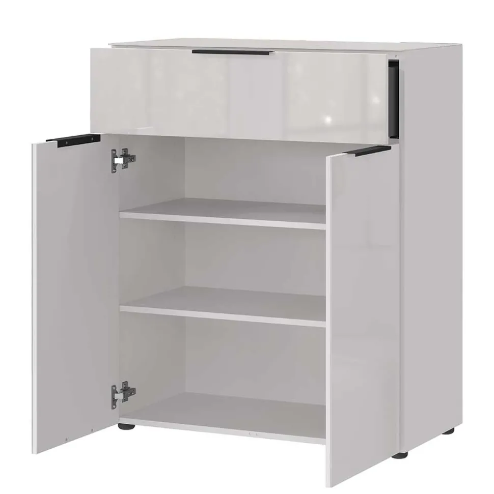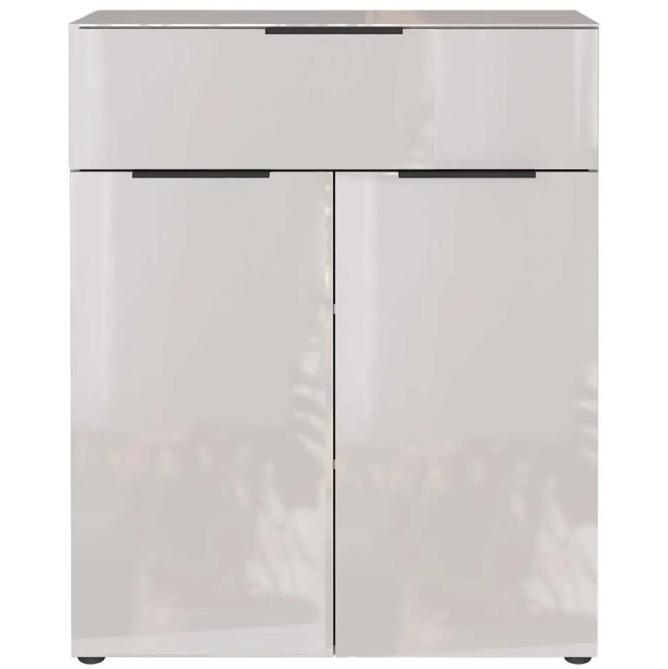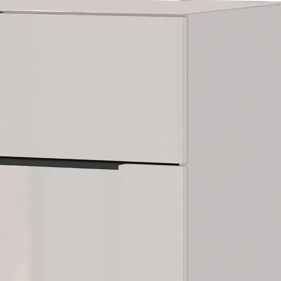 Geradlinigkeit, ausgewogene Proportionen und hochwertige Materialien prägen das Erscheinungsbild der Kommode. Die hellgraue Oberfläche verleiht dem Möbel eine ruhige, freundliche Ausstrahlung, die Wohnräume heller und großzügiger wirken lässt. Für den modernen Touch sorgen Elemente wie die Glasbeschichtung der Front und die Sicherheitsglasauflage auf der Deckplatte. Glas reflektiert das Licht subtil und sorgt für eine elegante, hochwertige Haptik. Gleichzeitig bringt es eine gewisse Leichtigkeit ins Design, die besonders in kleineren Räumen eine auflockernde Wirkung entfaltet.
