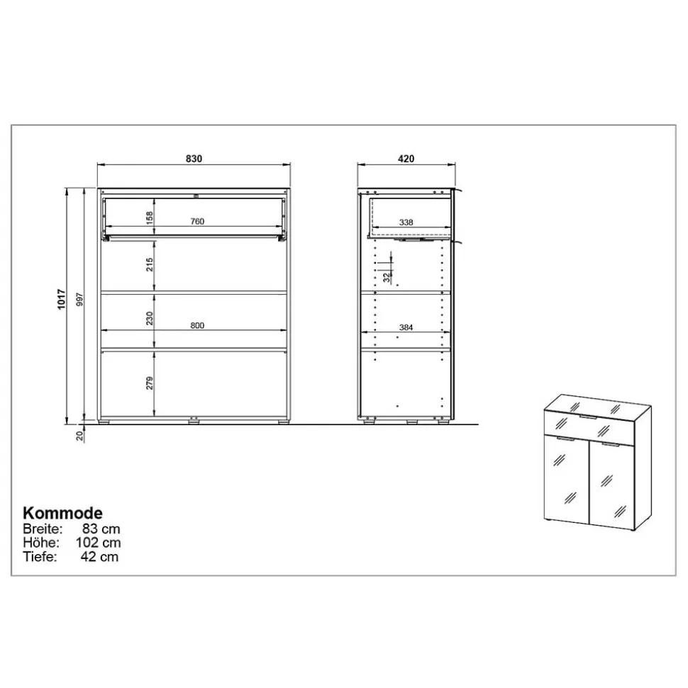 - Maximale Belastbarkeit: Schublade und Einlegeböden jeweils 10 kg, Unterboden 15 kg, Deckplatte 30 kg