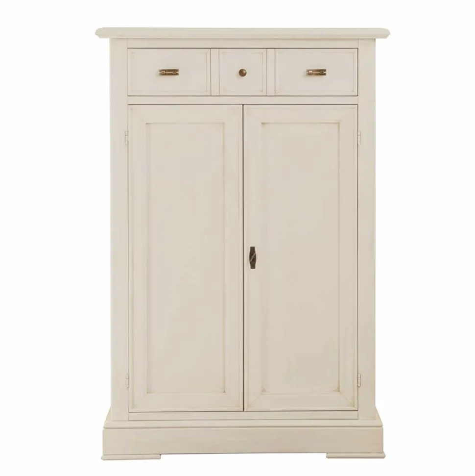 Typisch für Vertiko-Möbel verfügt die „Annot“ Vertiko-Kommode über eine breite Schublade im oberen Bereich. Die Front ist so gestaltet, dass optisch drei einzelne Schubladen vermutet werden könnten. Darunter sorgt eine abschließbare Doppeltür mit hochwertigen Metallscharnieren für sicheren Stauraum.