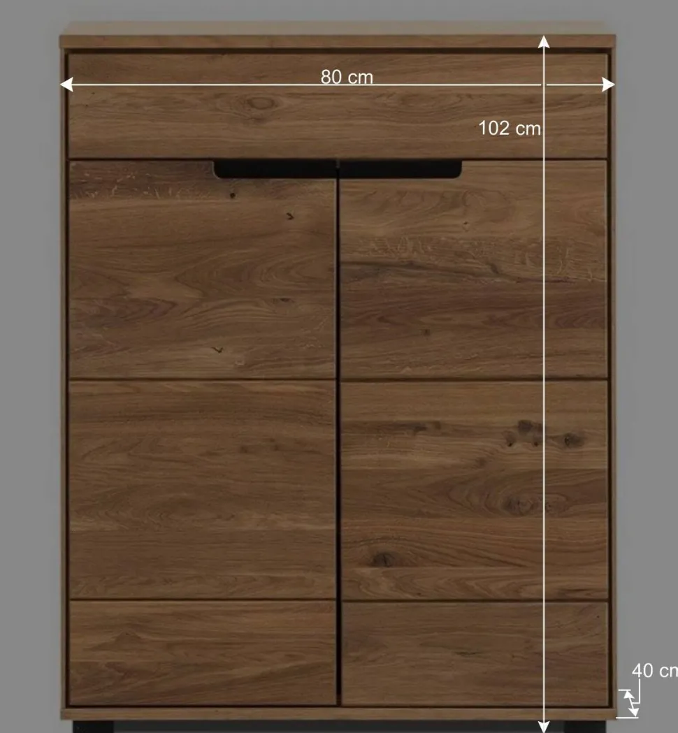 Mit einer Breite von 80 cm, einer Höhe von 102 cm und einer Tiefe von 40 cm ist genügend Platz für all Ihre Lieblingsstücke garantiert. Die beiden Türen mit Soft Close Metallbeschlägen schließen sanft und leise, was Stöße und Lärm verhindert. Schwarz hinterlegte Griffmulden setzen stilvolle Akzente und erleichtern das Öffnen. Im Inneren bieten zwei verstellbare Einlegeböden Flexibilität in der Aufbewahrung.