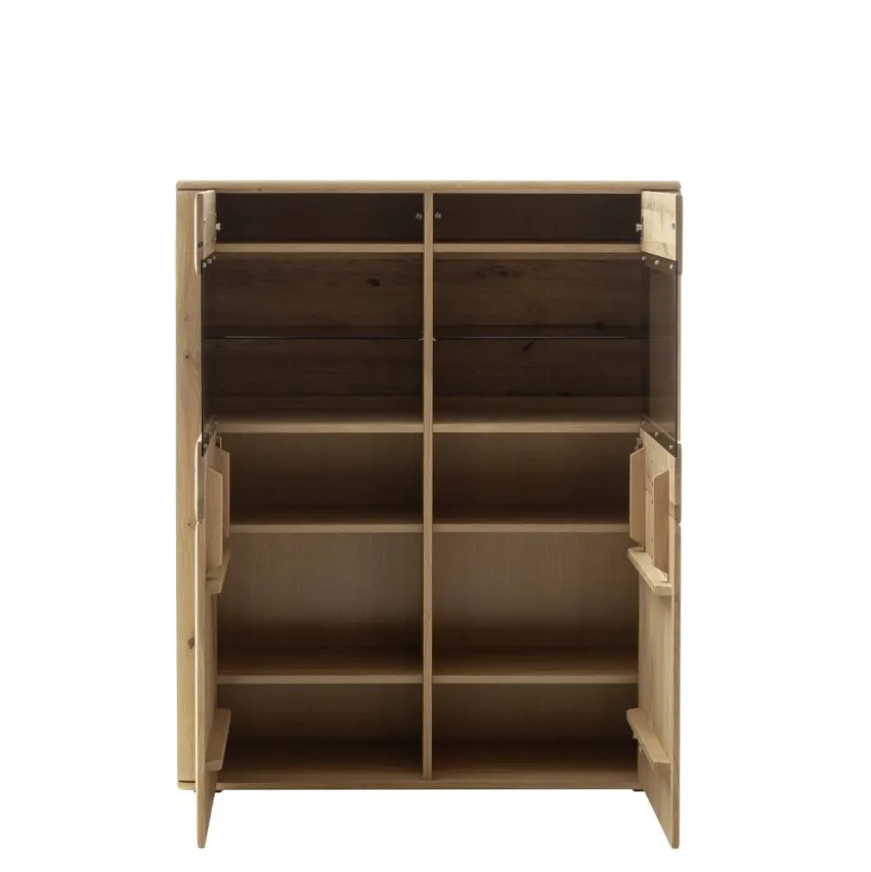 Die zwei Drehtüren sind mit ESG Parsolglas-Einsätzen in Braun versehen. ESG (Einscheiben-Sicherheitsglas) zeichnet sich durch seine hohe Schlag- und Stoßfestigkeit aus und sorgt für maximale Sicherheit. Parsolglas ist leicht getönt, reduziert Reflexionen und verleiht dem Möbelstück eine stilvolle, dezente Ausstrahlung.