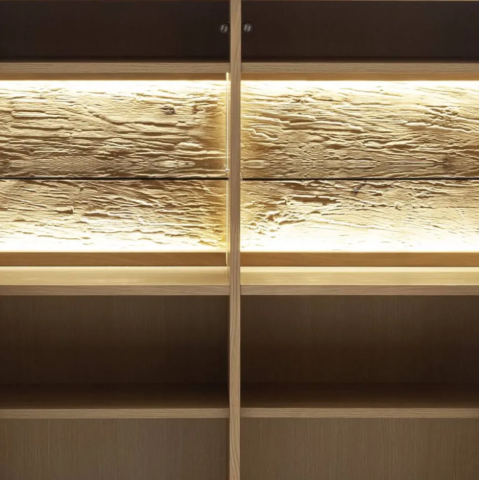 - HDF Rückwand innen in Holzoptik foliert, sichtbare Rückwand zusätzlich in 3D Optik geschroppt