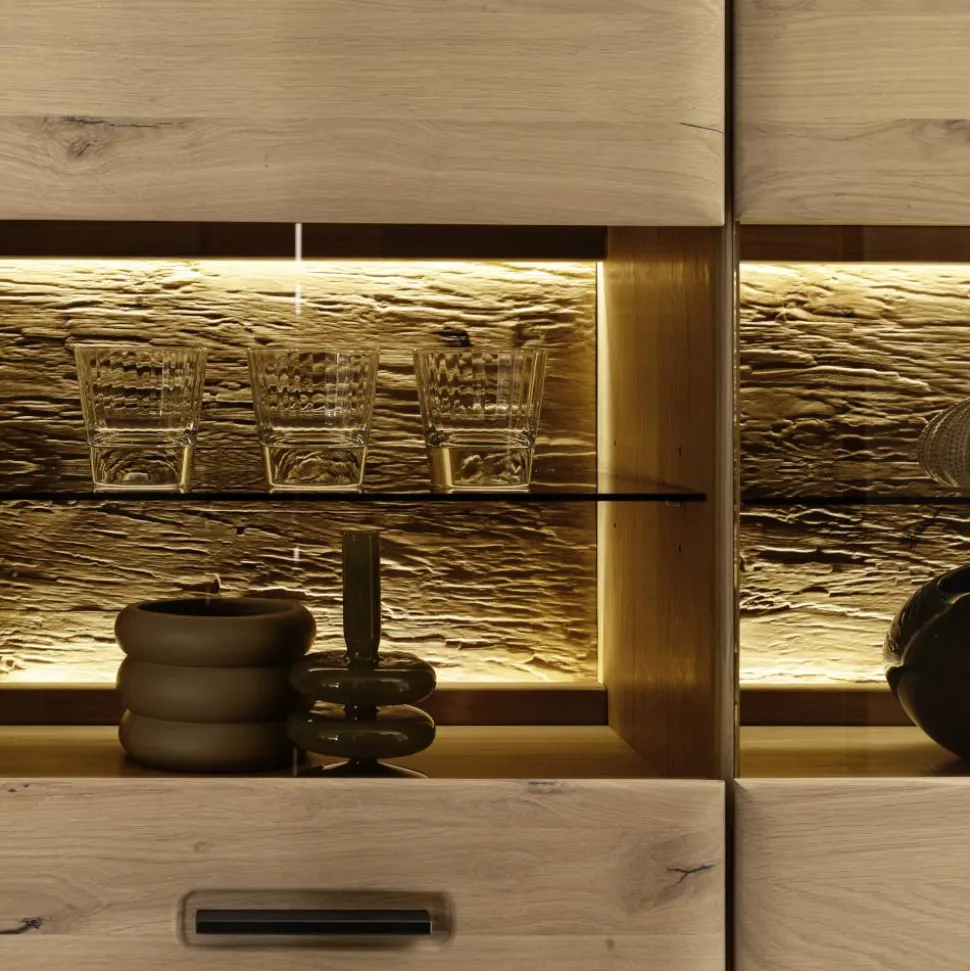 Gefertigt aus Holzwerkstoff und Massivholz, überzeugt der Vitrinenschrank „Jevedaz“ mit einer stabilen Konstruktion und fein bearbeiteten Oberflächen. Die Rückwand besteht aus HDF und ist innen mit einer Holzoptik-Folierung versehen. Sichtbare Rückwandelemente sind zusätzlich in 3D-Optik geschroppt, was dem Schrank eine besondere Tiefenwirkung verleiht.
