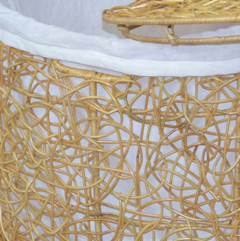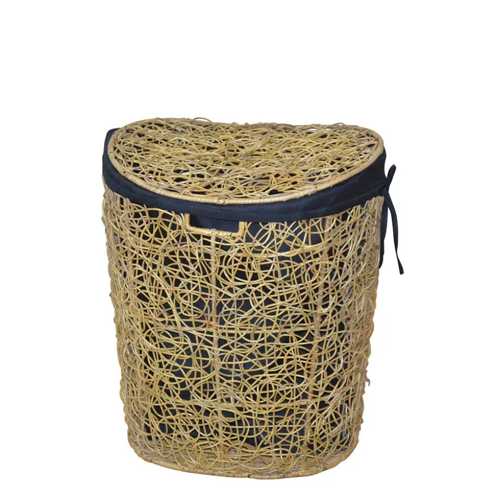 Der Wäschekorb „Sempra“ vereint kreative Flechtkunst mit funktionalem Design. In Natur gehalten und aus handgeflochtenem Rattanrohr gefertigt, beeindruckt er mit einer ausgefallen-unregelmäßigen Flechttechnik, die bewusst größere Zwischenräume lässt. Dadurch tritt das Stoffinlett optisch in den Vordergrund und beeinflusst die Gesamtwirkung des Korbes maßgeblich.