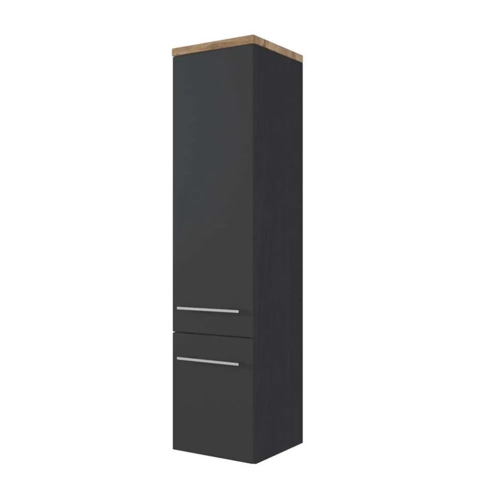 - Korpus in dunkel Grau melaminbeschichtet, Front in dunkel Grau und Deckplatte im Holzdekor Wildeiche foliert