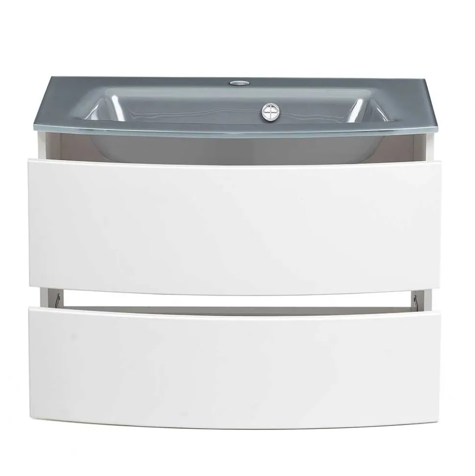 Entdecken Sie die perfekte Symbiose aus Stil und Funktionalität mit unserem Waschtisch „Mesciria“. Dieses herausragende Möbelstück, gefertigt in der Qualität deutscher Produktion, spiegelt das Beste modernen Designs wider. Die Front, aus hochwertigem MDF (Mitteldichte Faserplatte), bietet dank seiner dichten Faserstruktur eine hervorragende Basis für die matte, weiße Folierung. Dieses Material ist nicht nur robust, sondern auch leicht zu reinigen und resistent gegenüber alltäglichen Gebrauchsspuren. Der Korpus aus stabiler Spanplatte, beschichtet mit weißem Melamin, widersteht Feuchtigkeit und Kratzern, was ihn ideal für das Badezimmer macht. Die harmonische Farbgestaltung und die sanften, gebogenen Linien verleihen Ihrem Bad einen topaktuellen und zugleich zeitlosen Look.