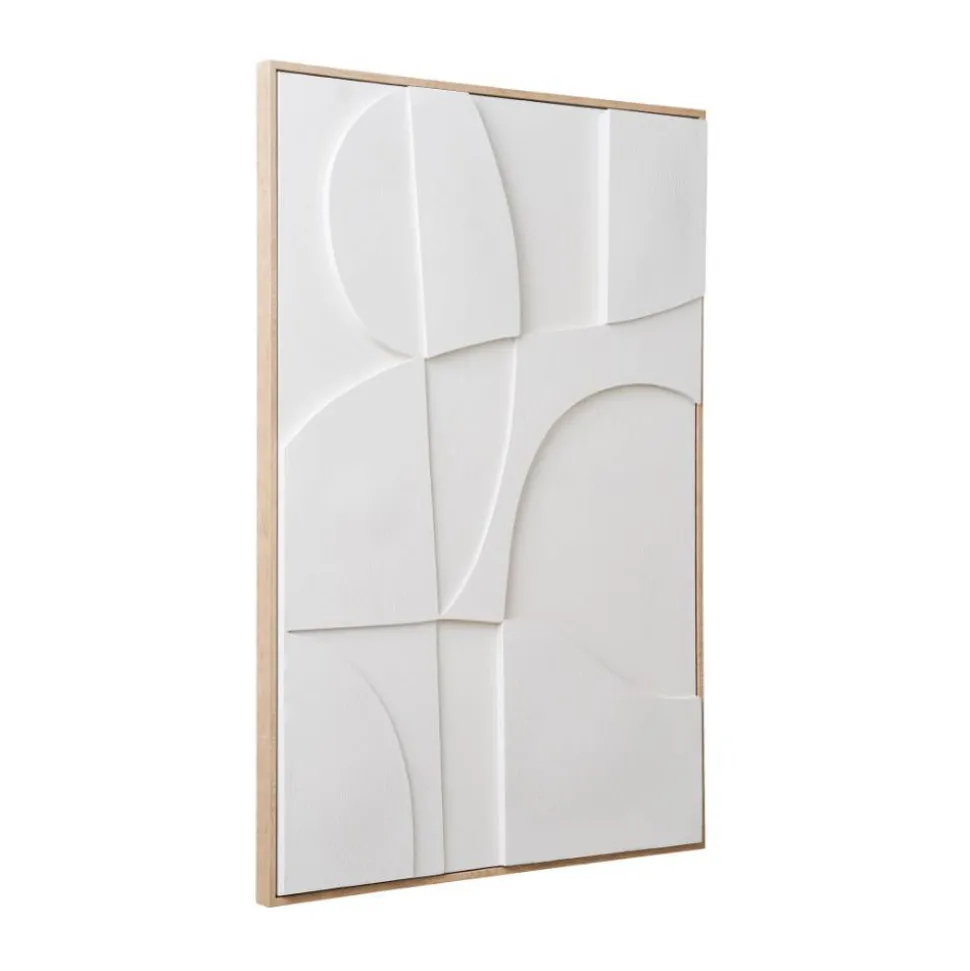 „Actino“ besteht aus einem hochwertigen Mix aus MDF, Polystyrene und Polyester. MDF – ein Holzwerkstoff mit homogener Dichte – bildet die stabile Basis. Das plastische Relief aus Polystyrene ist mit Polyester bezogen und weiß lackiert, wodurch die geometrischen Formen besonders präzise und klar zur Geltung kommen. Der Rahmen in Naturholzoptik rundet das Gesamtbild warm und stilvoll ab.