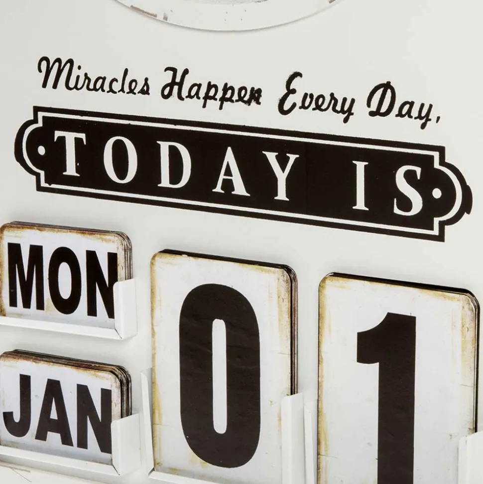 Oberhalb des Kalenders begrüßt Sie ein inspirierender Schriftzug: „Miracles happens every day. Today is“. Darunter finden sich die drei wichtigen Zeitbereiche – Wochentag, Monat und Datum – horizontal angeordnet und manuell einstellbar. Die Wochentage und Monatsnamen sind auf jeweils drei Buchstaben verkürzt und übereinander gruppiert, rechts davon markieren zwei austauschbare Ziffern das Tagesdatum. Das sorgt für Übersicht und eine persönliche Note – jeden Tag aufs Neue.