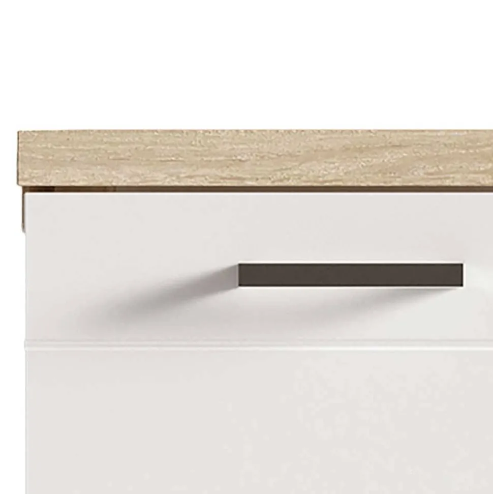 Hergestellt aus robustem Holzwerkstoff strahlt der „Faneto“ in Weiß und Sonoma Eiche. Die Front des Unterschranks begeistert mit einer hochglänzenden Oberfläche und raffinierter Rillenfräsung, während silberfarbige Kunststoff-Füße dem Möbelstück eine schwebende Leichtigkeit verleihen (Höhe ca. 1,5 cm).