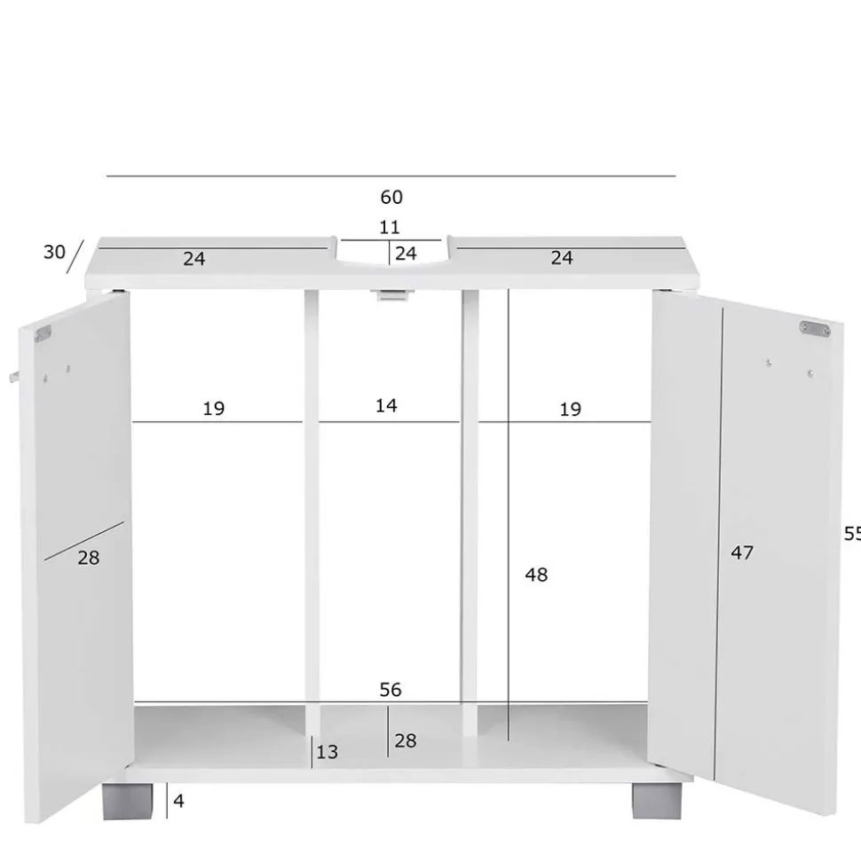 Praktikabilität wird hier großgeschrieben: Mit seinen Maßen von 60 cm Breite, 55 cm Höhe und 30 cm Tiefe passt „Hank“ ideal in kleine bis mittelgroße Badezimmer. Der vorgefertigte Siphon-Ausschnitt in der Deckplatte (Innenmaße: ca. 11 x 24 cm) sorgt für eine mühelose Integration unter Ihrem Waschbecken, ohne dass Anpassungen erforderlich sind. Gleichzeitig bietet der Unterschrank durch seine zwei Türen mit hochwertigen Metallscharnieren großzügigen Stauraum für Ihre Badutensilien. Von Handtüchern bis zu Reinigungsmitteln findet alles einen geordneten Platz.