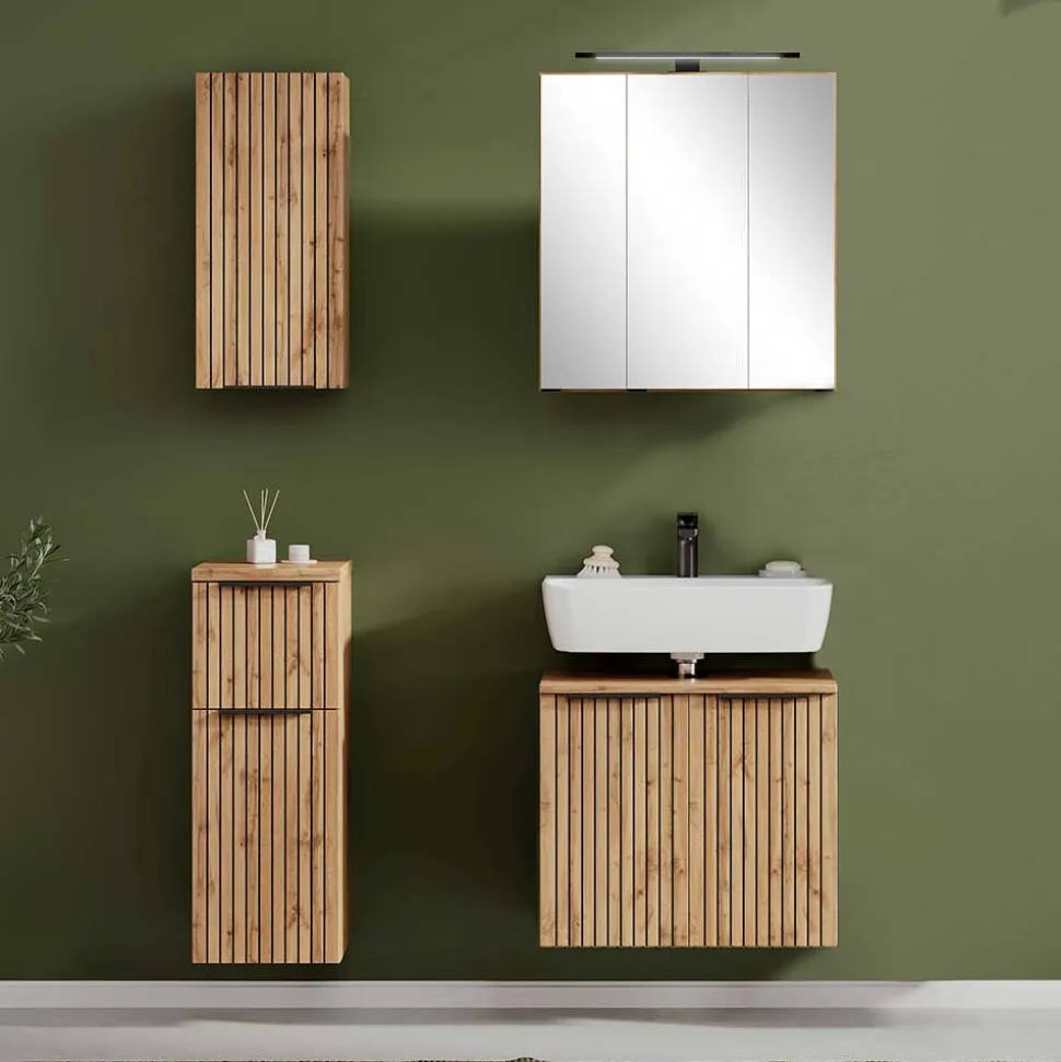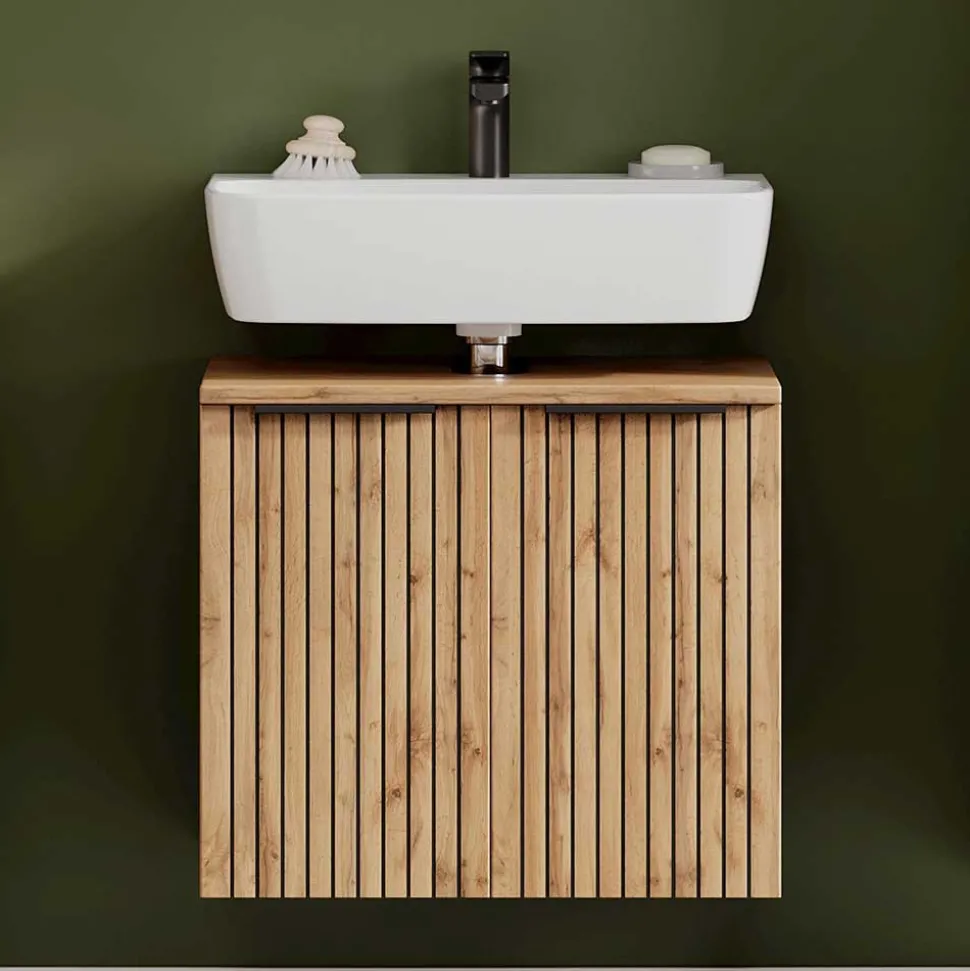 Ein stilvoller Blickfang in jedem Bad: Die harmonische Kombination aus authentischer Wildeiche-Holzoptik und elegantem Schwarz verleiht dem Waschbeckenunterschrank eine warme, moderne Ausstrahlung. Die Rillenoptik der Front, schwarz hinterlegt, verleiht dem Möbelstück Tiefe und Charakter – ein Designstatement mit Understatement. Die mattschwarz lackierten Metall-Kantengriffe greifen den Farbkontrast elegant auf und setzen markante Akzente.