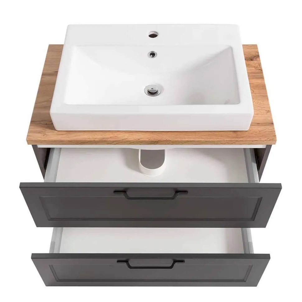 Mit dem Charme des Landhausstils zieht eine wohnliche und einladende Stimmung in Ihr Badezimmer ein. Dieser Stil steht für Natürlichkeit, rustikale Akzente und zeitlose Eleganz. Die Fronten in dekorativer Kassettenoptik vermitteln Tiefe und Charakter, erinnern an traditionelle Handwerkskunst und schaffen ein Gefühl von Geborgenheit. Gleichzeitig sorgen die modernen dunkelgrauen Flächen und die sanft gemaserte Wildeiche-Optik dafür, dass das Möbelstück nicht altmodisch wirkt, sondern sich perfekt in aktuelle Wohnkonzepte einfügt. Kleine schwarze Metallgriffe an den Türen des Spiegelschranks und Bügelgriffe an den Schubladen setzen stilvolle Akzente und ergänzen das harmonische Gesamtbild. Dieses Zusammenspiel aus traditionellem Flair und modernen Details macht „Novelya“ zu einem Highlight, das sowohl klassische als auch zeitgenössische Bäder aufwertet.