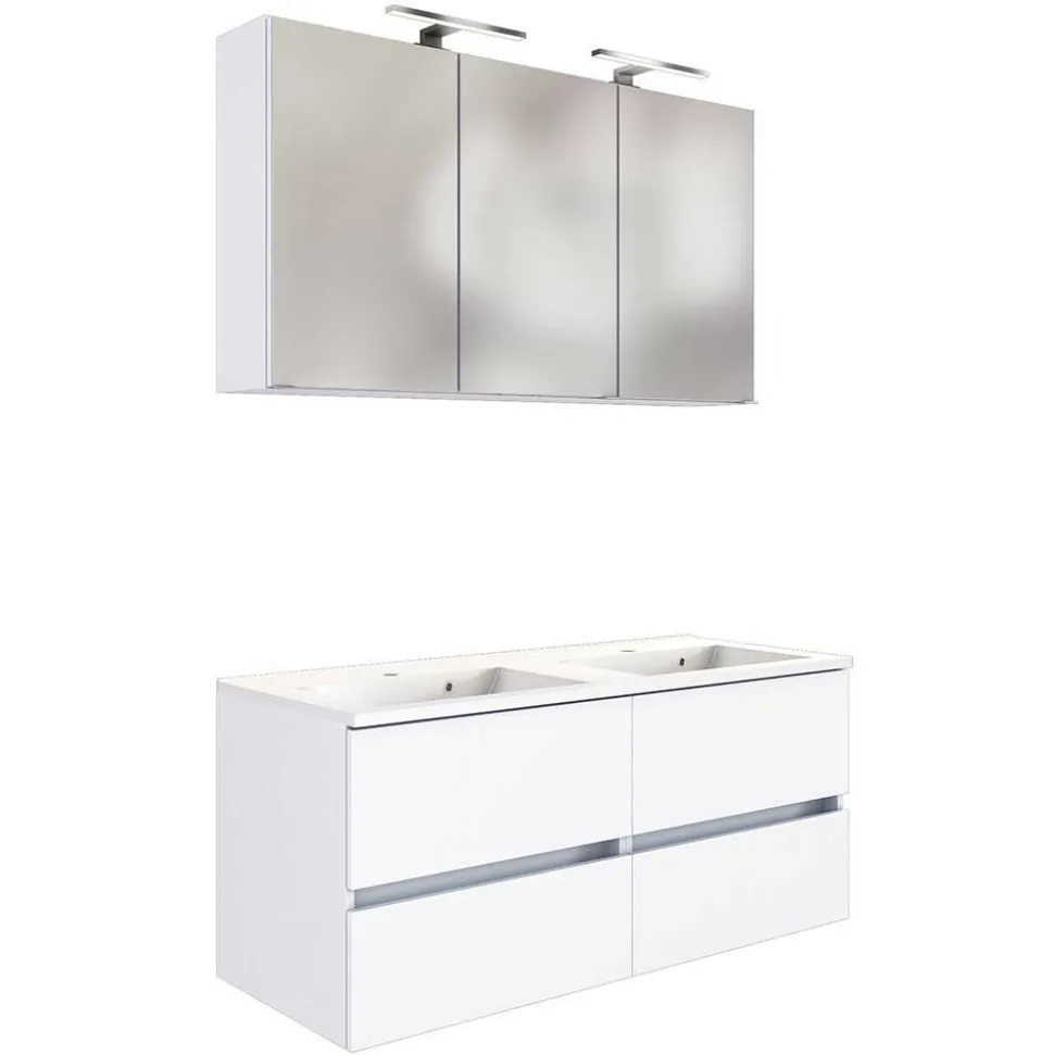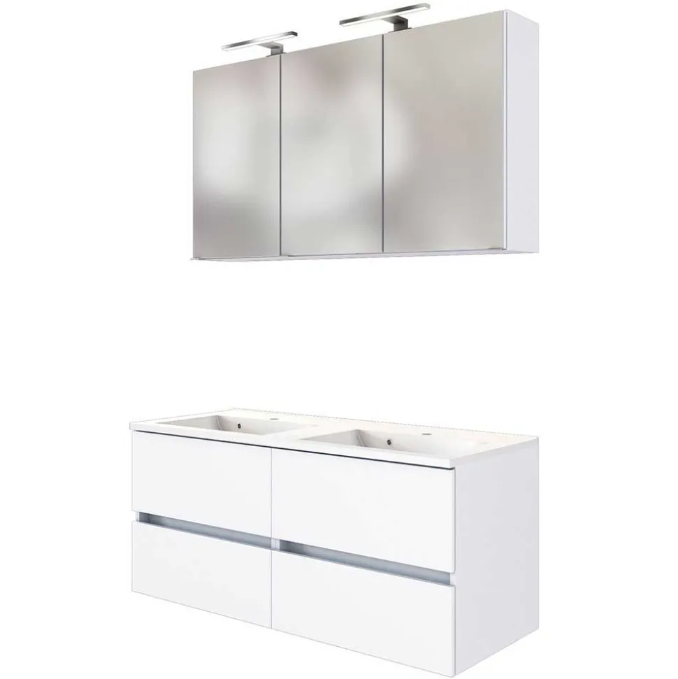 Diese hochwertige Kombination besteht aus einem großzügigen Spiegelschrank sowie einem formschönen Doppelwaschtisch. Beide Elemente sind zur Wandmontage vorgesehen, was nicht nur besonders platzsparend ist, sondern auch den modernen, schwebenden Look unterstreicht – ideal für kleinere Räume und designbewusste Bäder gleichermaßen. Das Möbelset wird zerlegt geliefert und lässt sich dank beiliegender Montageanleitung einfach selbst aufbauen.