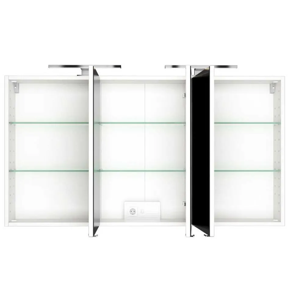 Mit Maßen von 120 x 64 x 20 cm (BxHxT) ohne Beleuchtung und 120 x 67 x 28 cm mit montierter LED-Aufbauleuchte bietet der Spiegelschrank großzügigen Stauraum. Drei Spiegeltüren mit vollständig verspiegelter Front verbergen sechs Glasböden (zwei hinter jeder Tür), auf denen Pflegeprodukte, Kosmetik und Accessoires übersichtlich Platz finden. Eine minimalistische Metallgriffleiste an der Unterkante sorgt für komfortables Öffnen. Im Innenraum befinden sich ein praktischer Schalter sowie eine Steckdose – perfekt für Rasierer, Haartrockner oder elektrische Zahnbürsten. Die energiesparende LED-Leuchte sorgt für optimale Ausleuchtung und ein angenehmes Ambiente am Waschplatz.