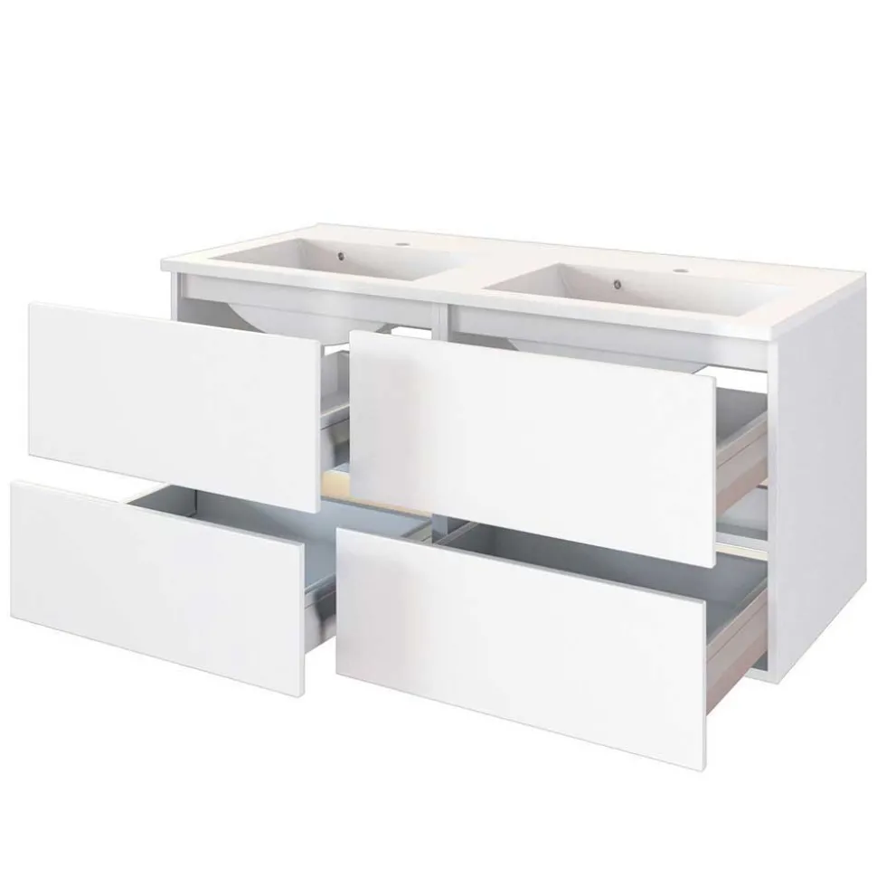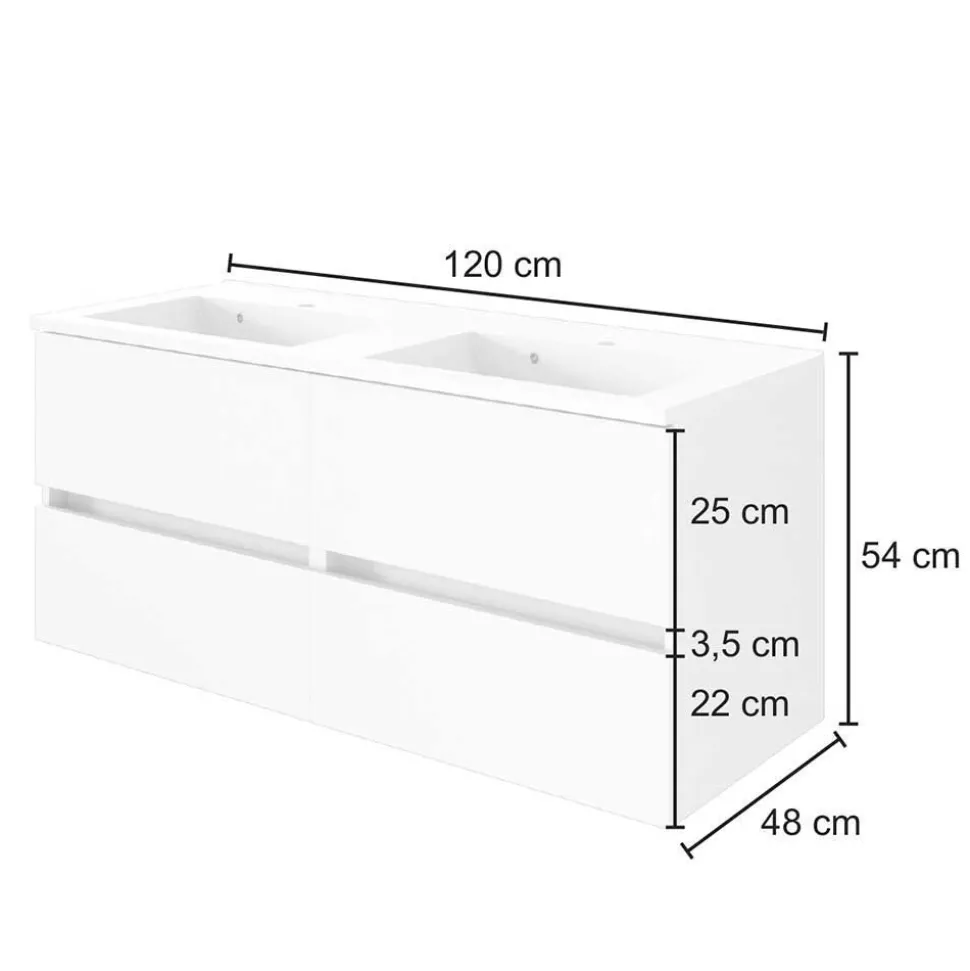 Mit Abmessungen von 120 x 56 x 47 cm (BxHxT) bietet der Waschtisch zwei pflegeleichte Mineralgussbecken – perfekt für Paare oder Familien, die morgens gleichzeitig starten wollen. Die Becken sind leicht zu reinigen, langlebig und optisch elegant. Armaturen sind nicht im Lieferumfang enthalten, doch die vorgebohrten Löcher ermöglichen eine schnelle, unkomplizierte Montage Ihrer Wunscharmaturen. Vier geräumige Schubladen mit Metallauszug und Soft-Close-Technologie sorgen für Ordnung und lassen sich ganz einfach über eine Griffmulde an der Unterseite öffnen. Kein lästiges Zuschlagen – hier schließt alles sanft und leise.