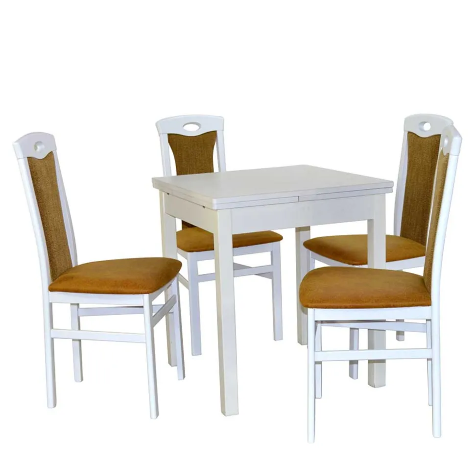 Vier formvollendete Stühle und ein geschmackvoll designter Tisch bilden gemeinsam die elegante Sitzgruppe „Calasso“. Ideal für den Essbereich, die Küche oder das Wohnzimmer, bietet dieses Set eine harmonische Kombination aus Design, Qualität und Alltagstauglichkeit. Das Zusammenspiel aus einem strahlenden Weiß und einem satten Ockergelb setzt dekorative Akzente und verleiht jedem Raum ein Gefühl von Wärme und klassischer Ästhetik.