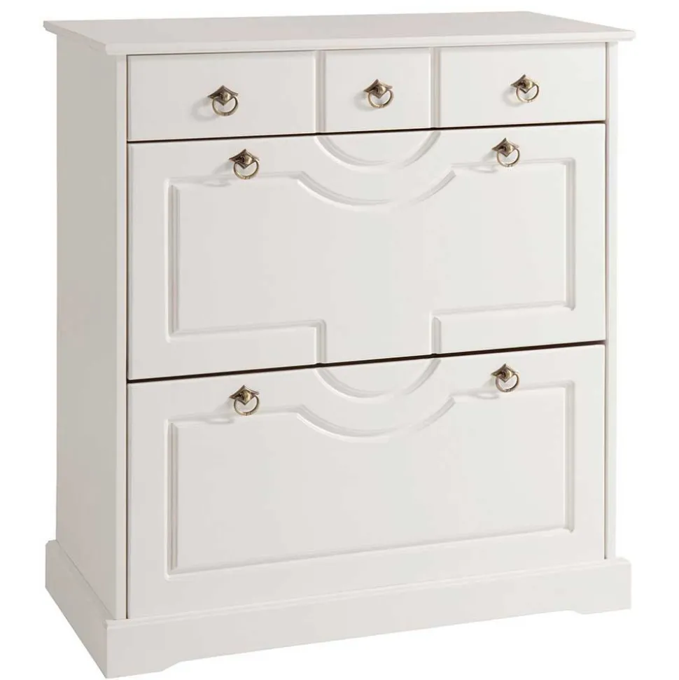 Eintreten in eine Welt der Ordnung und Schönheit: Die „Vesrav“ Serie umfasst einen geräumigen Schrank, eine funktionelle Schuhkommode und einen eleganten Spiegel. Jedes Element ist so konzipiert, dass es nicht nur ansprechend aussieht, sondern auch praktischen Stauraum bietet. Die besonders attraktiv gefrästen Fronten und die antik wirkenden Metall-Ringgriffe ergänzen sich zu einem stimmigen Gesamtbild, das Ihr Zuhause aufwertet.