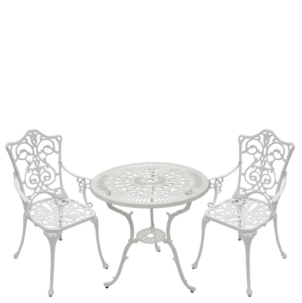Das Set besteht aus zwei stilvollen Stühlen und einem runden Tisch – ideal für gemütliche Stunden zu zweit oder als charmante Ergänzung für Ihre Gartenecke. Die harmonische Kombination sorgt für eine edle Optik und passt sich jeder Umgebung nahtlos an.