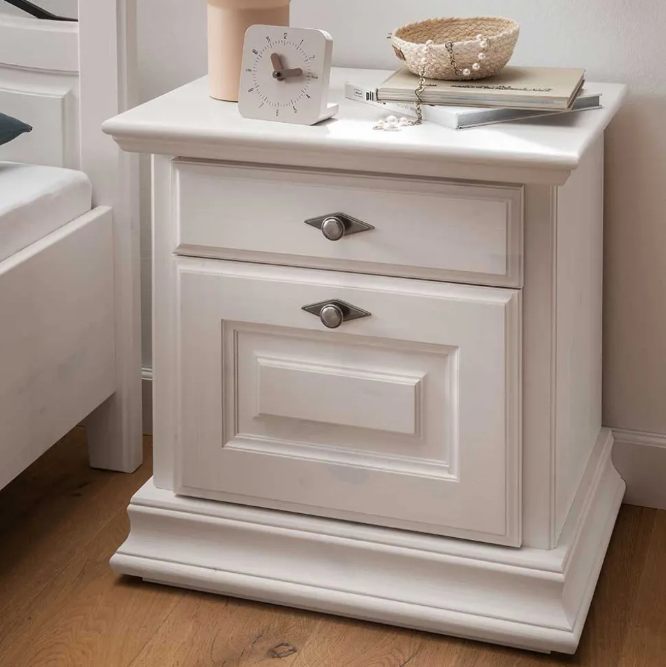 Entdecken Sie die Nachtkommode „Beato“ im angesagten Landhausstil, exklusiv bei Wohnen.de! Dieses hochwertige Möbelstück zeichnet sich durch seine erstklassige Material- und Verarbeitungsqualität aus, die für eine lange Lebensdauer sorgt. Hergestellt aus massivem Kiefernholz und weiß gewachst, überzeugt „Beato“ durch seine durchscheinende Holzmaserung und sorgt für eine gemütliche Atmosphäre in Ihrem Schlafzimmer.