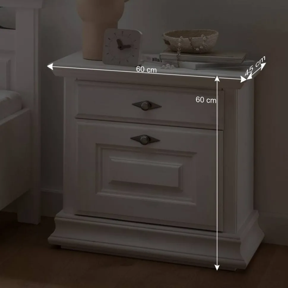 Die Nachtkommode „Beato“ verfügt über zwei geräumige Schubladen mit Metall-Vollauszug, die viel Stauraum für Ihre Utensilien bieten. Die handlichen Metall-Knopfgriffe erleichtern das Öffnen und Schließen der Schubladen, während das formschöne Sockelgestell und die dekorativ gefräste Deckplatte den charmanten Landhausstil unterstreichen.