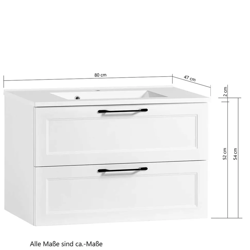 Mit einer Breite von 80 cm, einer Höhe von 56 cm und einer Tiefe von 47 cm bietet „Gyatso“ ausreichend Stauraum, ohne im Badezimmer zu viel Platz einzunehmen. Zwei großzügige Schubladen in dekorativer Kassettenoptik schaffen Ordnung im Alltag – sei es für Pflegeprodukte, Handtücher oder Reinigungsmittel. Dank hochwertiger Metallauszüge und integrierter Soft-Close Funktion schließen sie sanft und geräuschlos. In der oberen Schublade ist ein Siphonausschnitt bereits integriert, sodass der Waschtisch funktional durchdacht und sofort einsatzbereit ist.