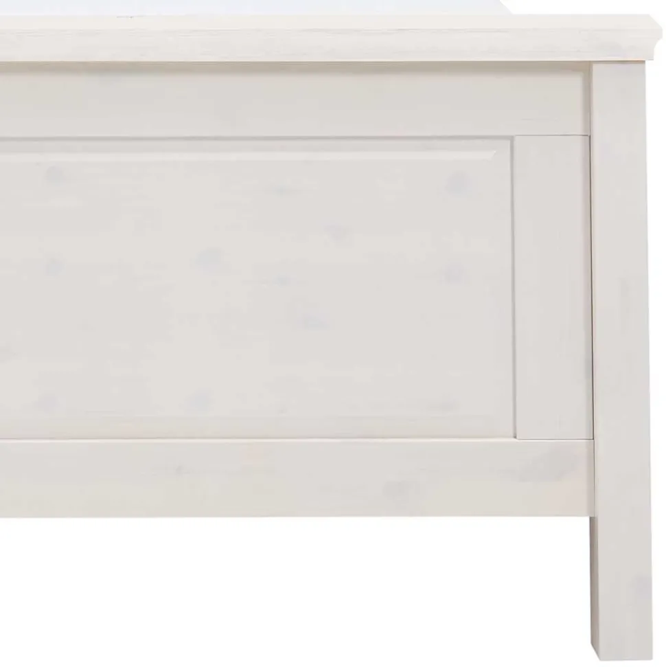 Das Bettgestell des Modells Satumare ist aus nordischem Kiefer Massivholz gefertigt. Die Oberflächen sind für eine einfache Pflege in Weiß lackiert, wobei die Holzmaserung und die für Kiefer typischen Äste noch gut erkennbar sind. Das weiße Bett Satumare verfügt über ein 93,5 cm hohes Kopfteil und 72 cm hohes Fußteil – jeweils in gerader Ausführung und in attraktiver Kassetten-Optik gestaltet.