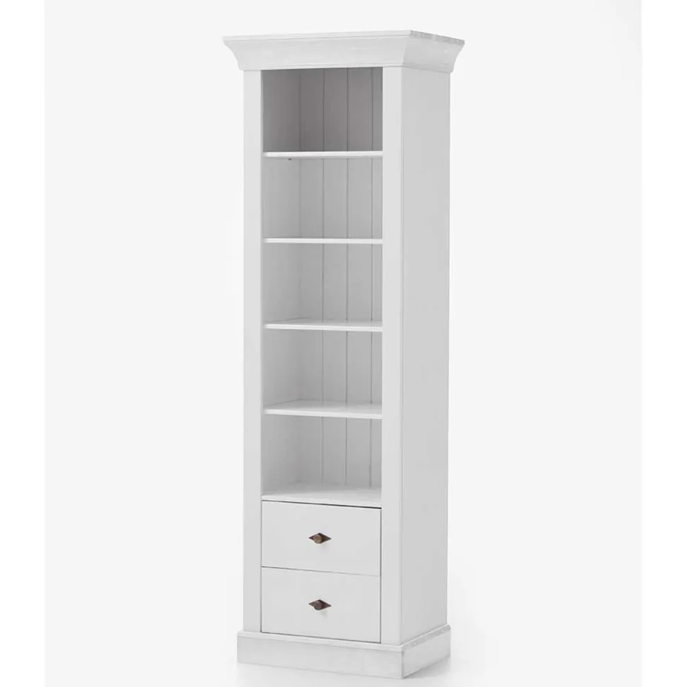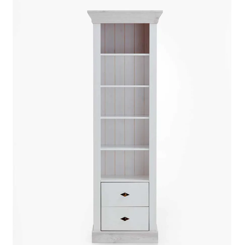 Die Oberflächen des Regals sind in einem strahlenden Weiß lackiert, wobei die durchscheinende Maserung des Holzes für einen Hauch von Natürlichkeit sorgt. Diese Lackierung bietet nicht nur Schutz, sondern unterstreicht auch die hochwertige Anmutung des Möbelstücks.