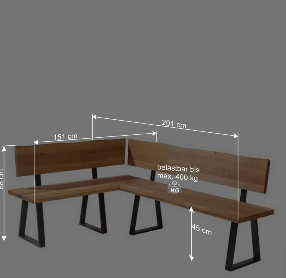 Mit einer Breite von 151 cm, einer Höhe von 88 cm und einer Tiefe von 201 cm passt die Eckbank ideal in viele Räume, ohne zu viel Platz einzunehmen. Da die Tiefe variieren kann, da das Holz direkt aus dem Baum geschnitten wurde, erhalten Sie ein Möbelstück, das die natürliche Unregelmäßigkeit der Natur widerspiegelt – jeder einzelne Zentimeter ist einzigartig.