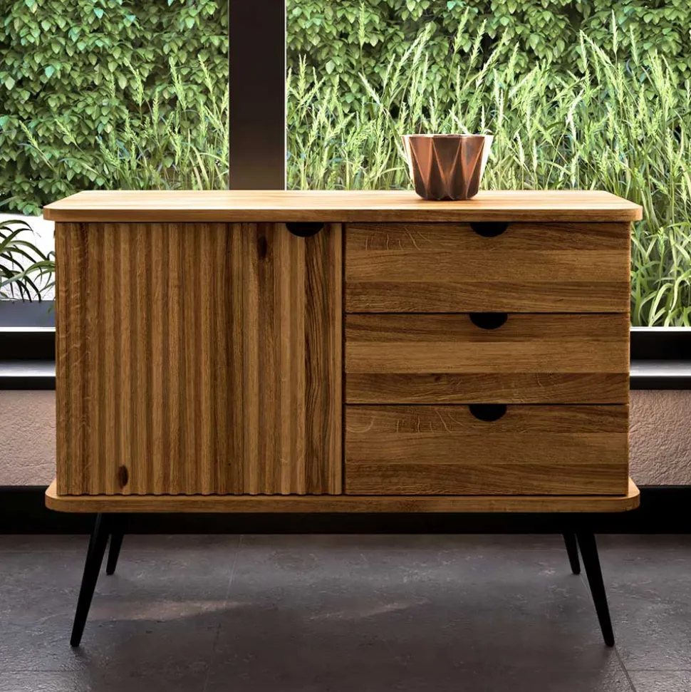 Diese stilvolle Kommode zeichnet sich durch ihr modernes, kontraststarkes Design aus und ist aus massiver Wildeiche gefertigt, einem besonders robusten und langlebigen Material. Wildeiche ist bekannt für ihre einzigartige, authentische Maserung, wodurch jedes Möbelstück zu einem Unikat wird. Darüber hinaus ist Wildeiche widerstandsfähig gegen Kratzer und Abnutzung, was zu ihrer Langlebigkeit beiträgt.