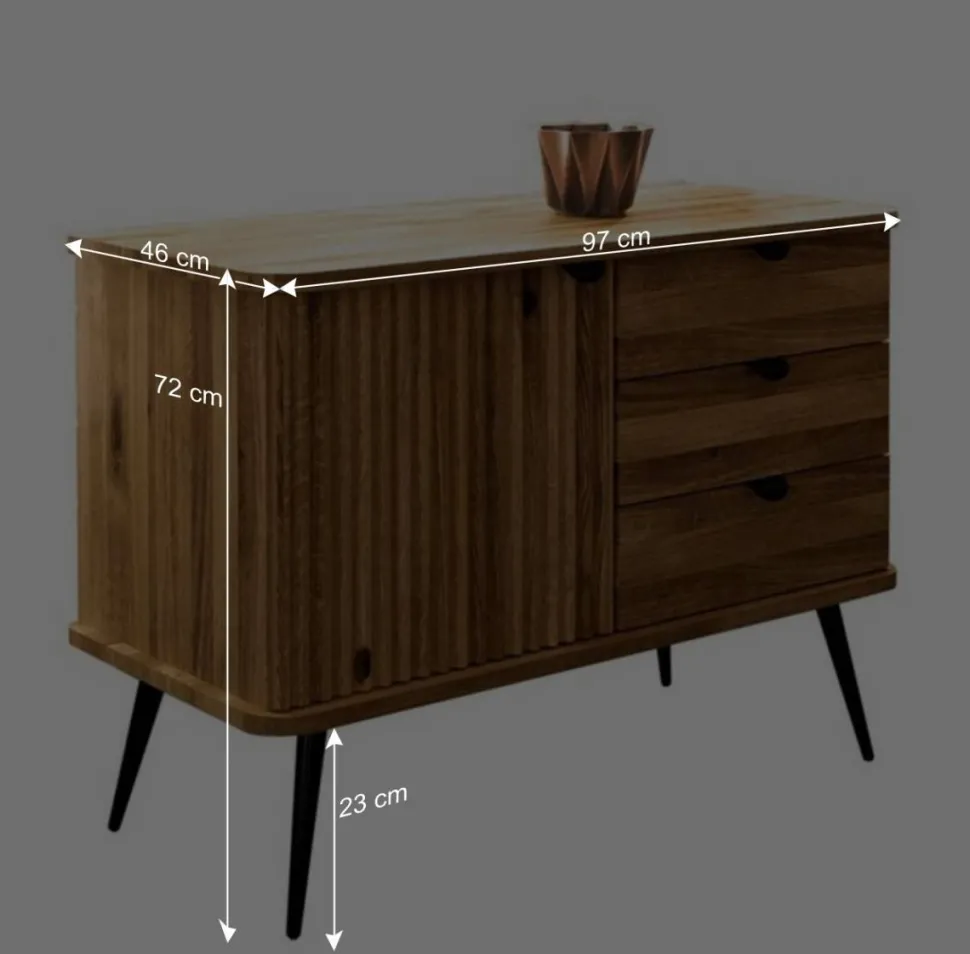 Das Möbelstück ruht auf einem Metall-Vierfußgestell, das in Schwarz matt lackiert ist und konisch zulaufende Beine aufweist. Die Füße sind etwa 23 cm hoch und bieten genügend Raum für einfaches Reinigen unter der Kommode.