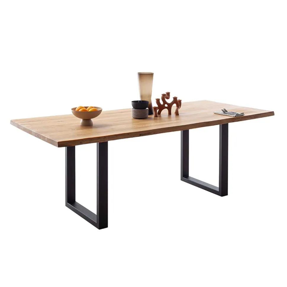 Gefertigt aus hochwertigem Wildeiche Massivholz, das durchgehende Lamellen aufweist, garantiert dieser Tisch nicht nur Langlebigkeit, sondern auch ein einzigartiges Design. Die natürliche Holzoberfläche ist sorgfältig geölt, was die Schönheit des Materials noch verstärkt und gleichzeitig vor äußeren Einflüssen schützt. Die spezielle Baumkante macht jedes Stück zu einem Unikat – direkt aus dem Stamm geschnitten, zeigt der Tisch, wie das Holz gewachsen ist. In Kombination mit dem pulverbeschichteten, schwarzen Bügelgestell aus Metall entsteht ein harmonisches Zusammenspiel aus Holz und Metall, das für Stabilität sorgt und zugleich einen modernen Akzent setzt.