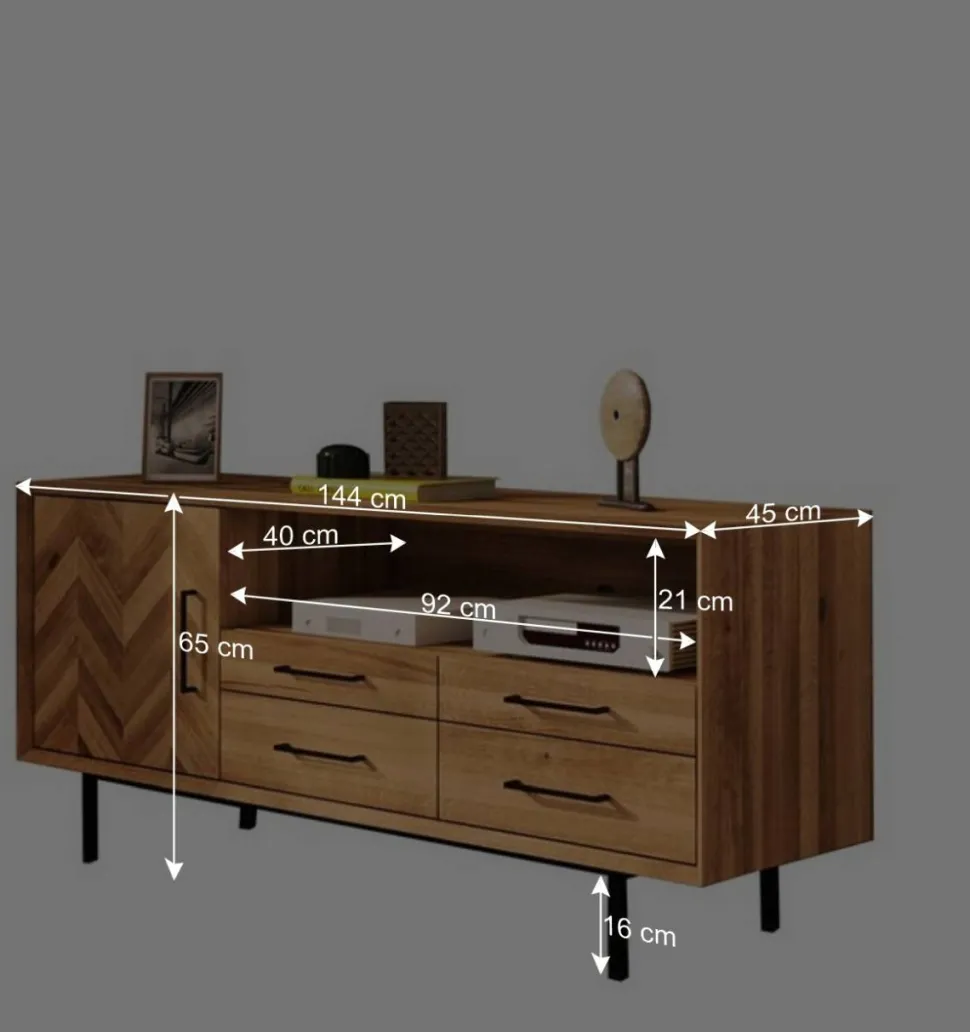 Mit einer Breite von 144 cm, einer Höhe von 65 cm und einer Tiefe von 45 cm bietet das TV Board ausreichend Platz für Ihre Mediengeräte und Zubehör. Vier Schubladen in zwei verschiedenen Größen mit Metall-Kugelauszug und Soft Close Funktion ermöglichen eine übersichtliche Aufbewahrung. Eine Tür mit gedämpften Metallbeschlägen und einem beeindruckenden Fischgrätenmuster verleiht dem Möbelstück eine elegante Note. Im Inneren befindet sich ein Einlegeboden für zusätzlichen Stauraum. Handliche Metall-Bügelgriffe sorgen für eine komfortable Bedienung.