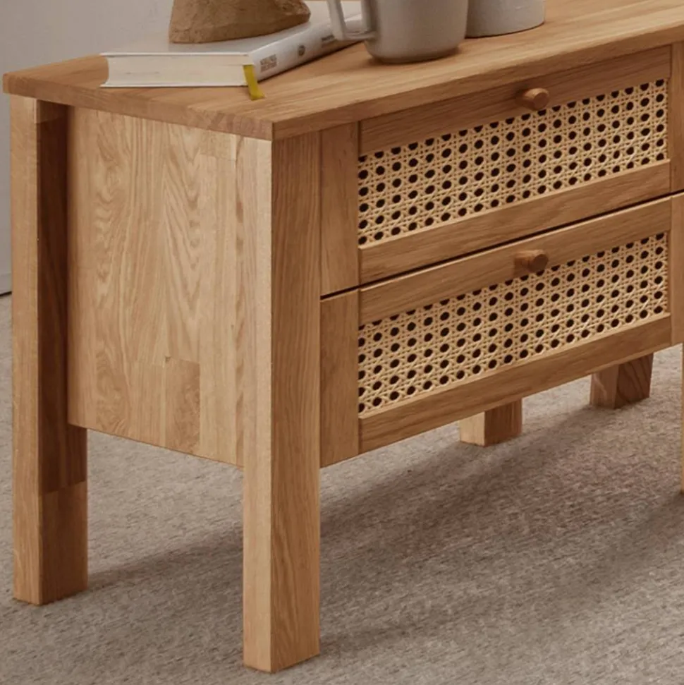 Entdecken Sie die Wildeiche Nachtkommode „Ambrosso“ – ein echtes Schmuckstück für Ihr Schlafzimmer. In den warmen, natürlichen Tönen von Wildeiche und Beige gehalten, fügt sich das Möbelstück perfekt in jeden Raum ein und sorgt für eine angenehme Atmosphäre. Die Kombination aus Massivholz und Peddigrohr im ansprechenden Wiener Geflecht Stil verleiht der Kommode einen besonderen Charme, der sich ideal in ein modernes Skandi-Design integriert.