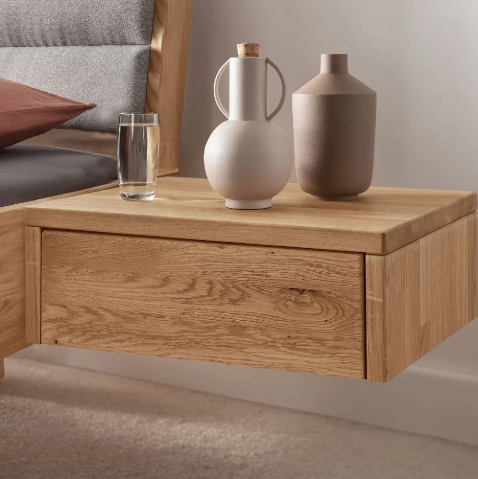 „Sangre“ ist zur seitlichen Befestigung am Bettrahmen vorgesehen und schafft so eine schwebende Optik. Oben befindet sich eine Ablagefläche für alles, was Sie griffbereit halten möchten. Darunter verbirgt sich eine Schublade mit Metallauszug und komfortabler Tip-on-Funktion (Push-to-open) – ideal für persönliche Dinge, die Sie sicher verstauen wollen.