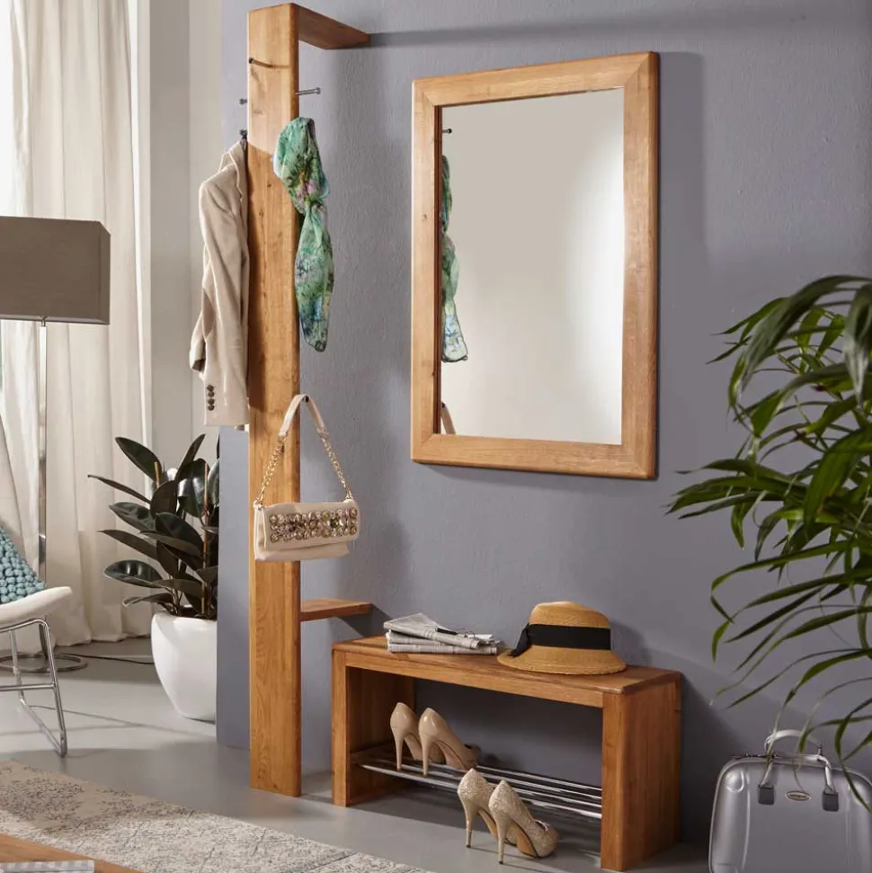Ein durchdachtes Set aus Garderobenbank, Spiegel und Standgarderobe sorgt für Ordnung und Stil im Eingangsbereich. Jedes Teil wurde sorgfältig gestaltet, um Funktionalität und Design in Einklang zu bringen.