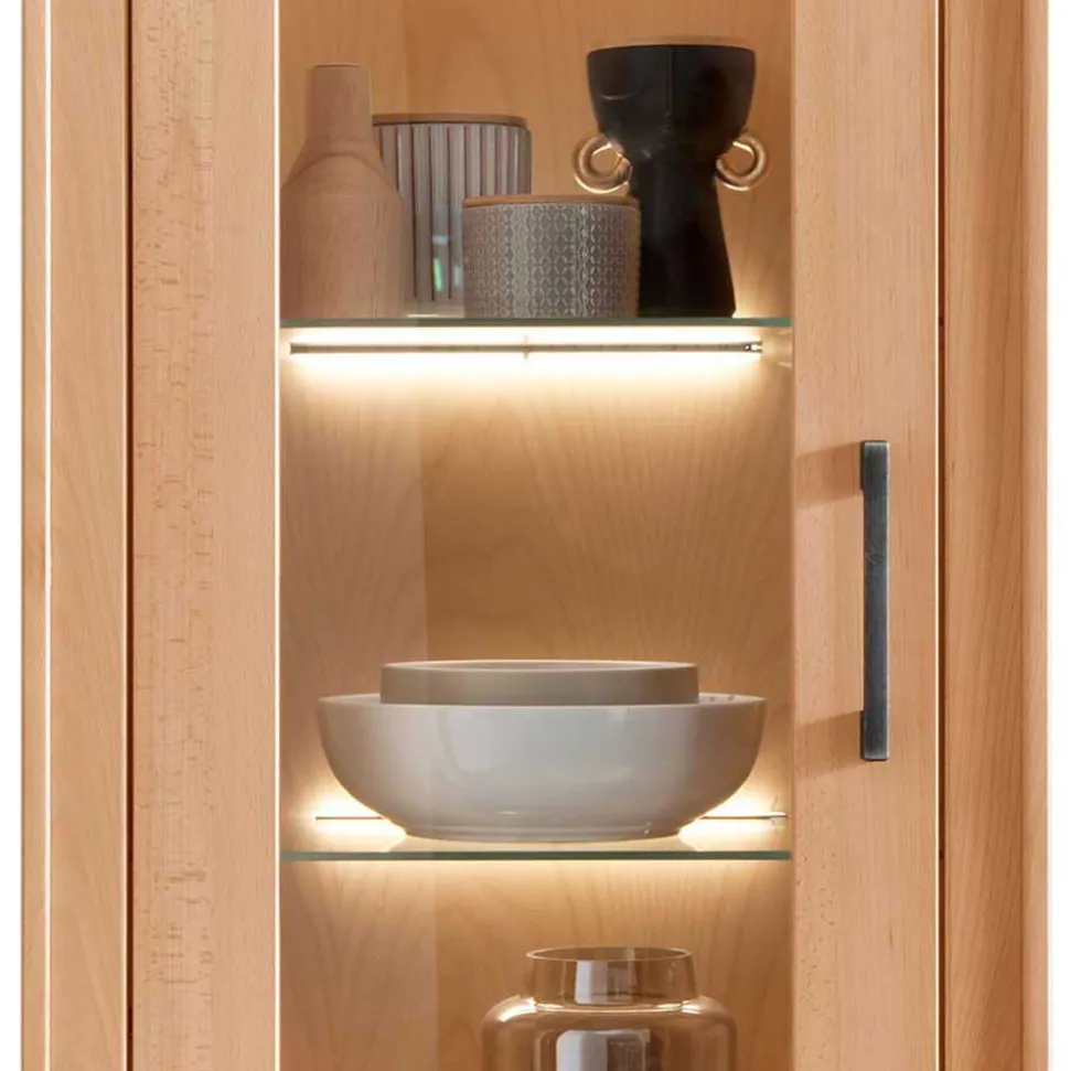 Die Wohnwand „Sarosca“ besteht aus einem Highboard, einem TV-Board, einer Vitrine und einem Wandboard. Sie ist nicht nur optisch ansprechend, sondern auch von hoher Qualität dank der Herstellung aus massivem Kernbuchenholz. Das verwendete Kernbuchenholz ist bekannt für seine Stabilität und seinen warmen Farbton. Mit seinen durchgehenden Lamellen in Deckplatten und Fronten sowie keilverzinkten Seiten und Innenausstattung bietet es eine beeindruckende Langlebigkeit und Ausdruckskraft. Es verleiht dem Möbelstück nicht nur Charakter, sondern auch eine einzigartige Ausstrahlung.Die natürlichen geölten Oberflächen unterstreichen die natürliche Schönheit des Holzes und bieten gleichzeitig Schutz. Diese Behandlung erhält die Atmungsaktivität des Holzes, unterstützt seine Fähigkeit, das Raumklima zu regulieren, und verleiht ihm eine angenehm glatte Oberfläche.